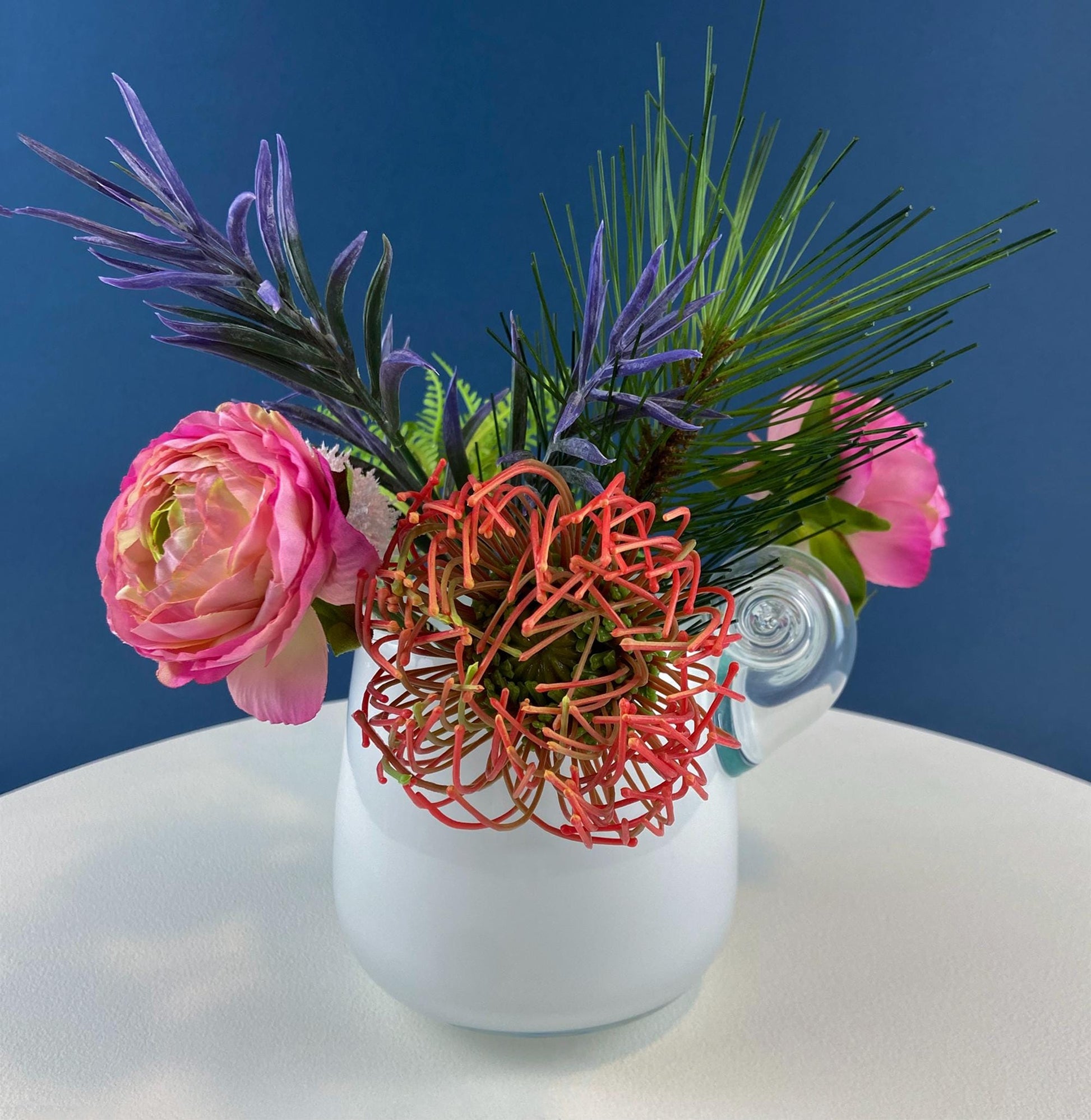 Modern White & Clear Glass Vase with Swirl Handle. Unique White Cased Hand Blown Art Glass with Scroll. Bath Storage. Interior Design Ideas. Gift for Him or Her. Glass Lover. Excellent Condition. Air Bubbles Present due to its Hand-Made Nature. Not Marked by the Manufacturer.