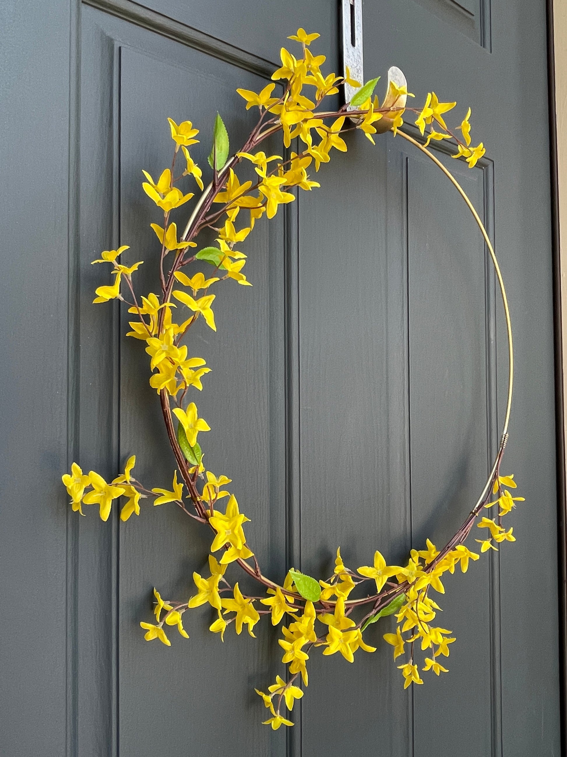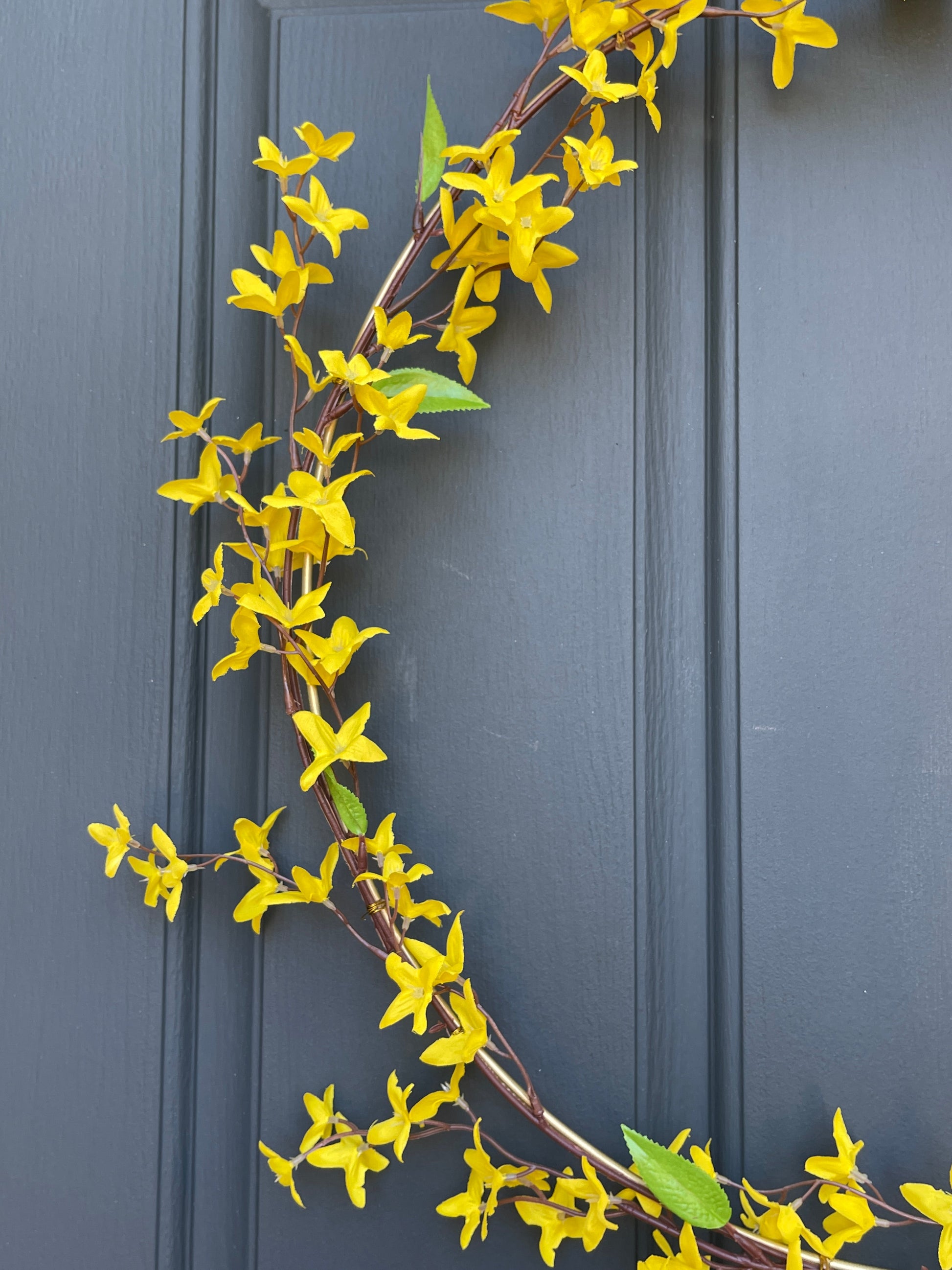 Welcome your family and friends into your home with this modern summer wreath. This minimalistic hoop wreath has been handcrafted on a matte gold hoop and is trimmed with artificial yellow forsythia spray. This hoop wreath is also the perfect housewarming or birthday gift.