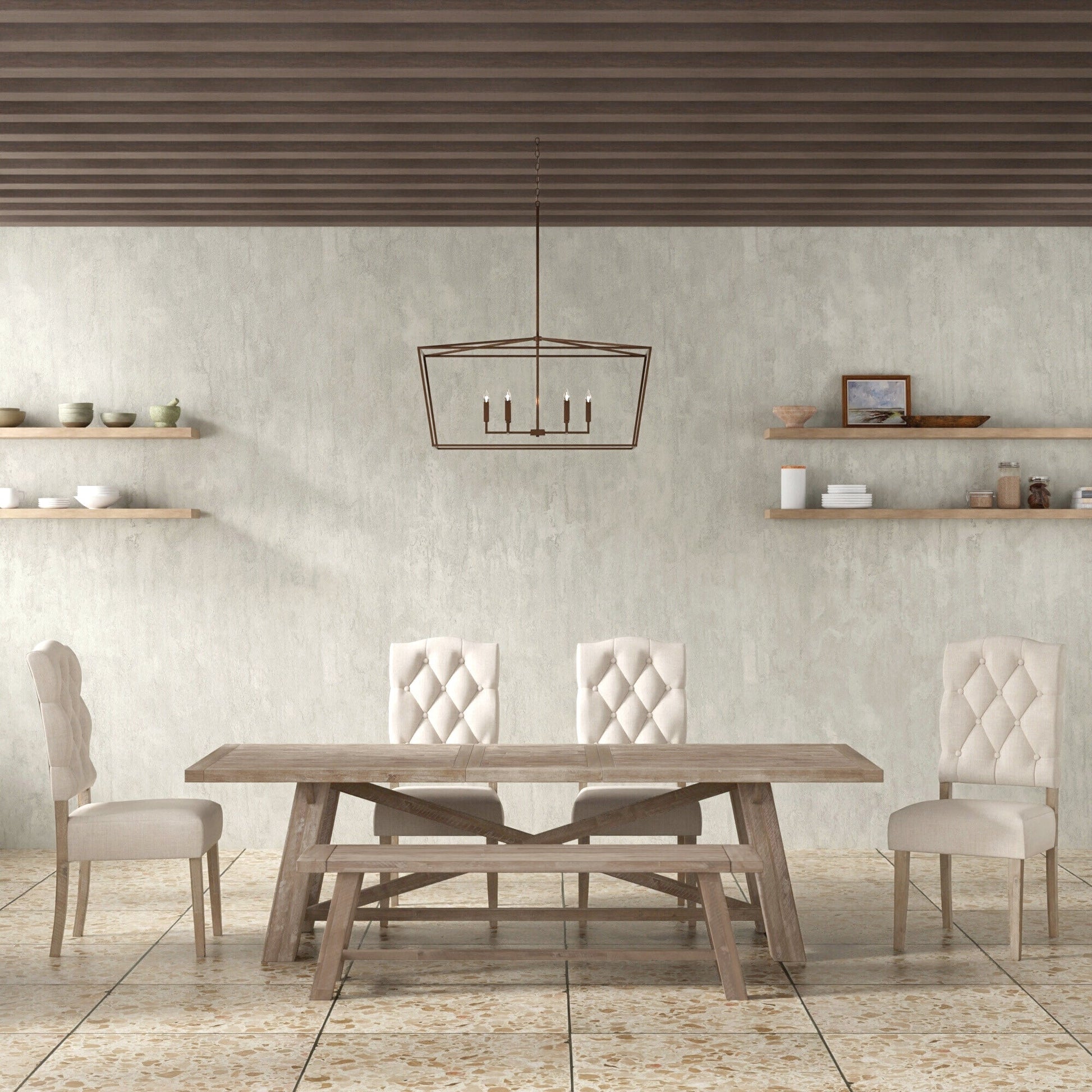 A beautiful Weathered Natural wood finish brings rustic elegance to your dining room with the Newberry Rectangular Dining Table. A removable leaf lengthens the table from 88 inches to 103 inches, making ample room to seat eight. Using sustainable wood resources, this table is constructed with Acacia wood and built with angled legs with an x-design at its base for both aesthetic appeal and stability. Designed with hosting in mind, this dining table is styled well with a combination of a bench and dining chairs sold separately. Complete the room setting with the beautiful, matching 3 drawer/3 door Sideboard, also sold separately.