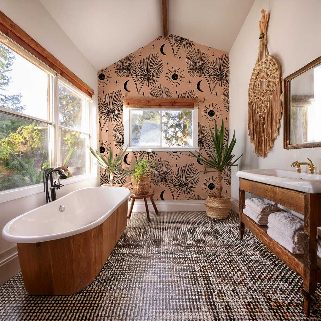 Transform your space into a luxurious oasis with our Night Palm Wallpaper, featuring artwork by Samantha Santana. Inspired by starry summer nights, this wallpaper adds warmth and charm. Choose between easy peel and stick or smooth traditional paste installation. And it's removable - perfect for a sophisticated and ever-changing aesthetic.