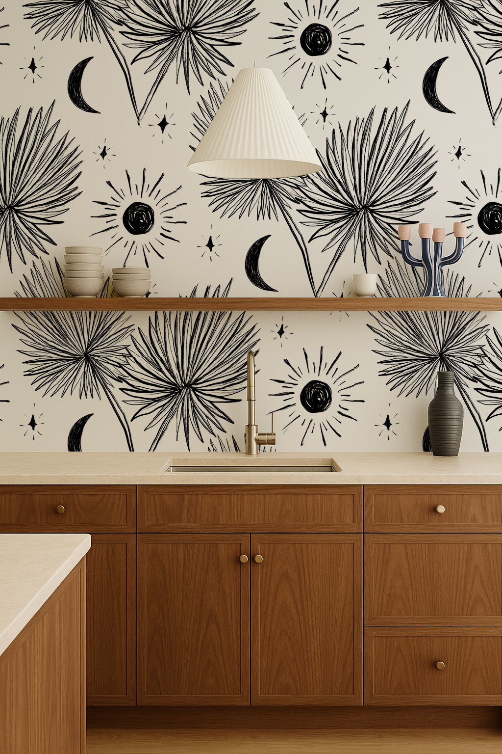 Transform your space into a luxurious oasis with our Night Palm Wallpaper, featuring artwork by Samantha Santana. Inspired by starry summer nights, this wallpaper adds warmth and charm. Choose between easy peel and stick or smooth traditional paste installation. And it's removable - perfect for a sophisticated and ever-changing aesthetic.