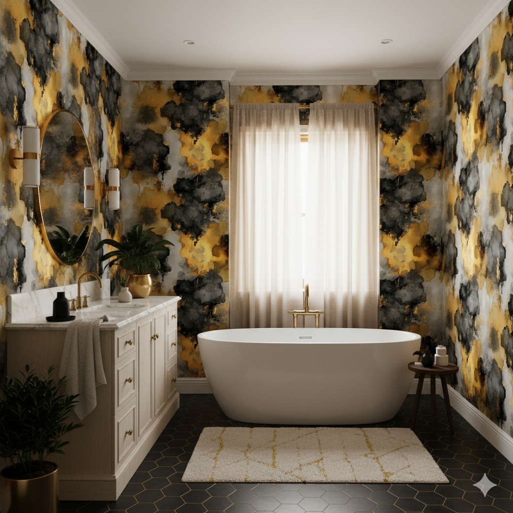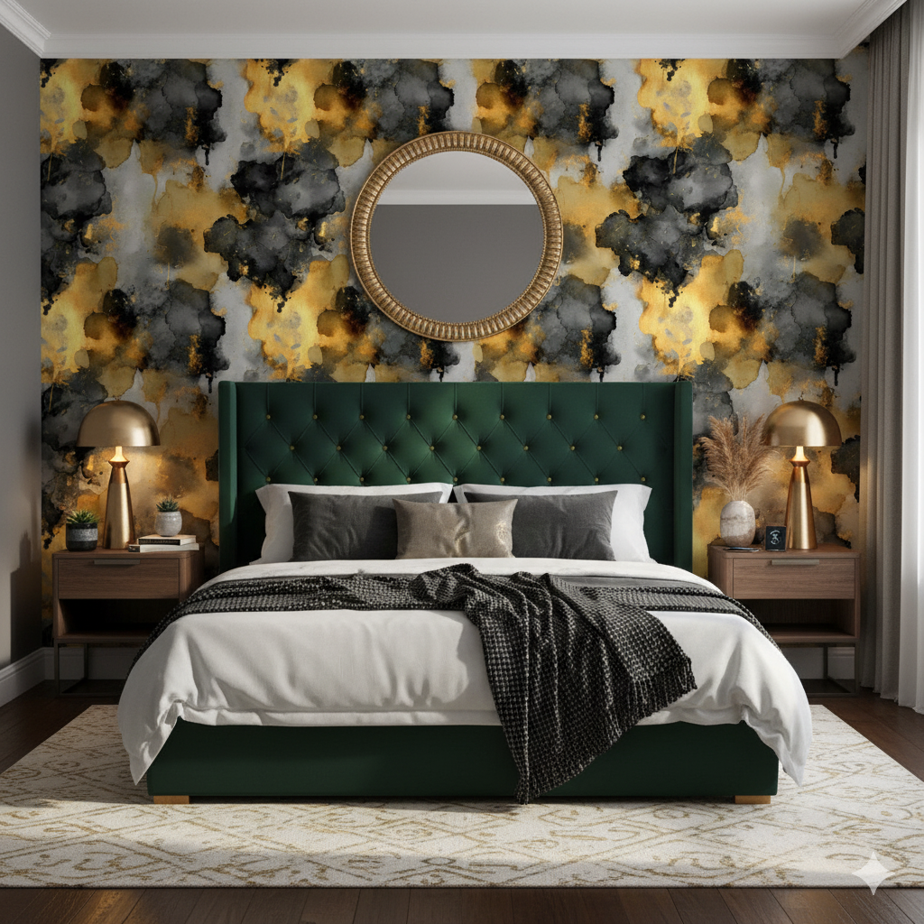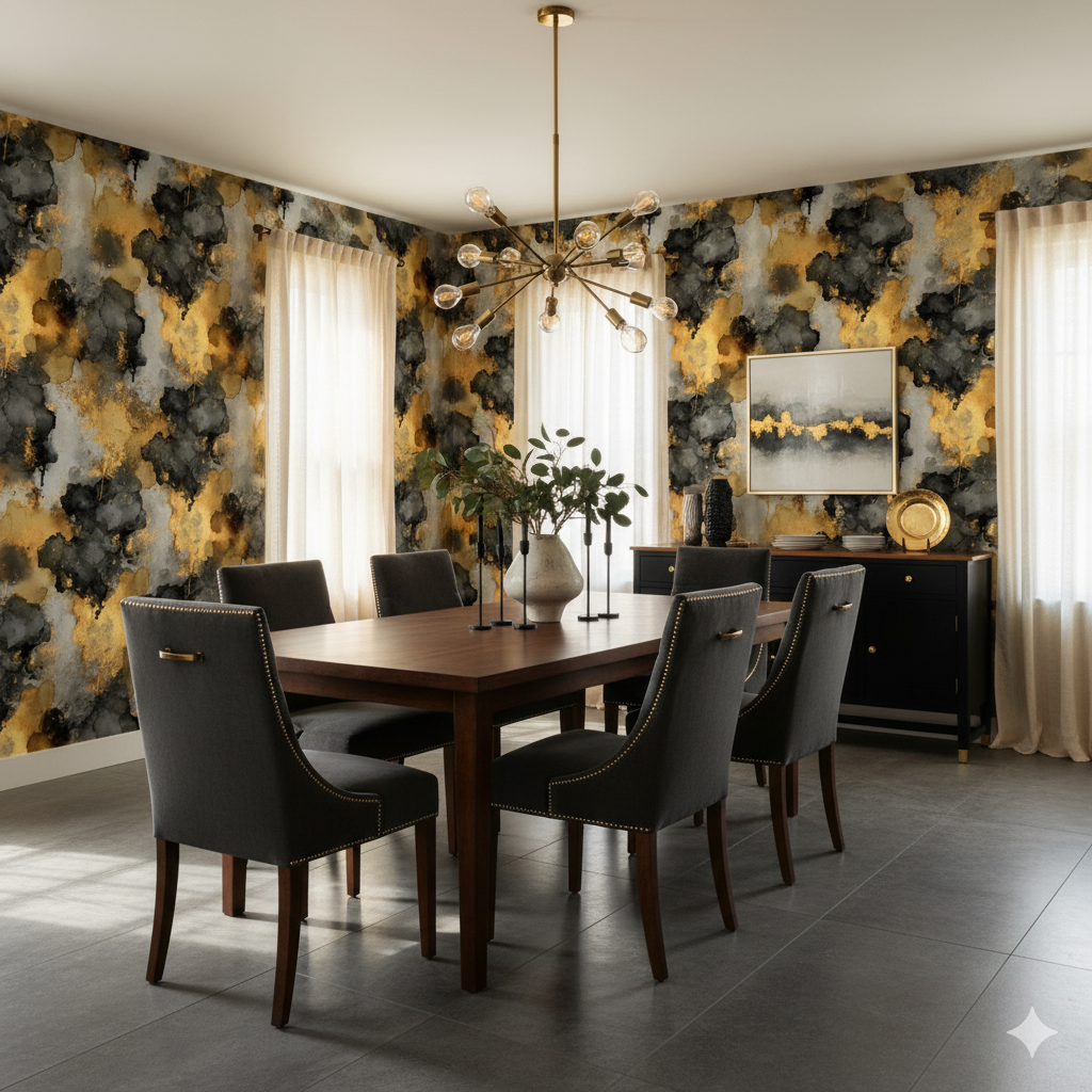 This wallpaper bursts with a dramatic interplay of shadow and brilliance, where velvety washes of black melt into storm-gray blotches, only to be pierced by molten flashes of radiant gold. The pattern feels like an abstracted Rorschach for luxury interiors, evoking the sensation of fire meeting smoke, or ink bleeding across parchment gilded by alchemy. Its richly organic flow makes it ideal for bold accent walls in dining rooms, modern lofts, or moody cocktail bars that embrace theatrical design. The metallic tones catch light beautifully, adding shimmer and dimension, while the darker fields ground the palette in sophistication. A perfect pairing for gold fixtures, black leather, or even minimalist Scandinavian furniture looking for a decadent twist.