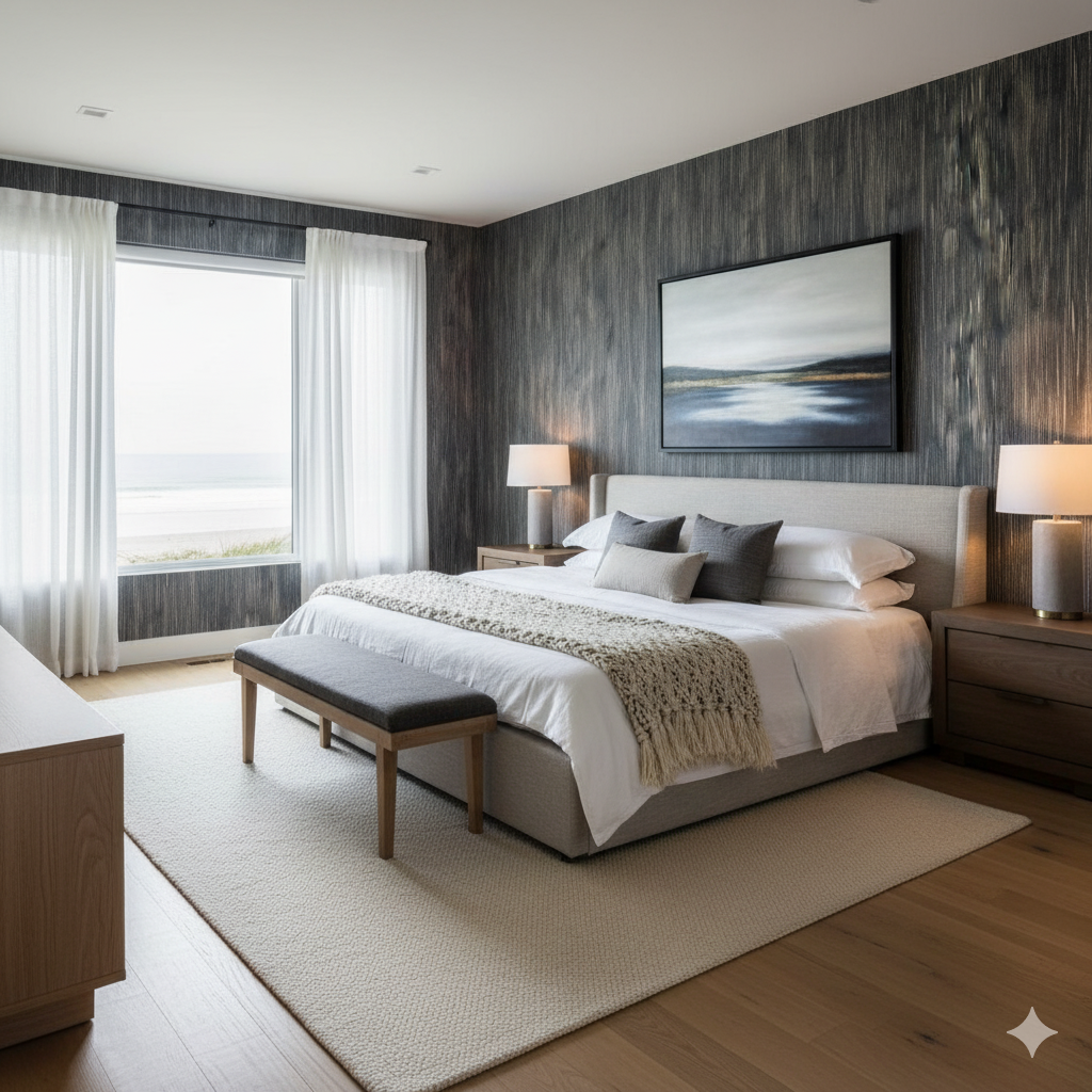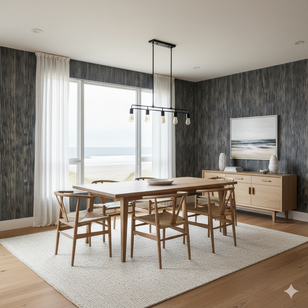 A dark, contemporary design featuring fine vertical streaks of chalky white etched against a deep charcoal-black base. The repetition mimics strands of grass or textile weaves, offering a tactile illusion of depth. The pattern has a moody sophistication, ideal for accent walls in modern lofts, dramatic dining rooms, or moody home offices. It pairs well with metallic finishes, concrete textures, or minimalist Scandinavian-inspired furniture.