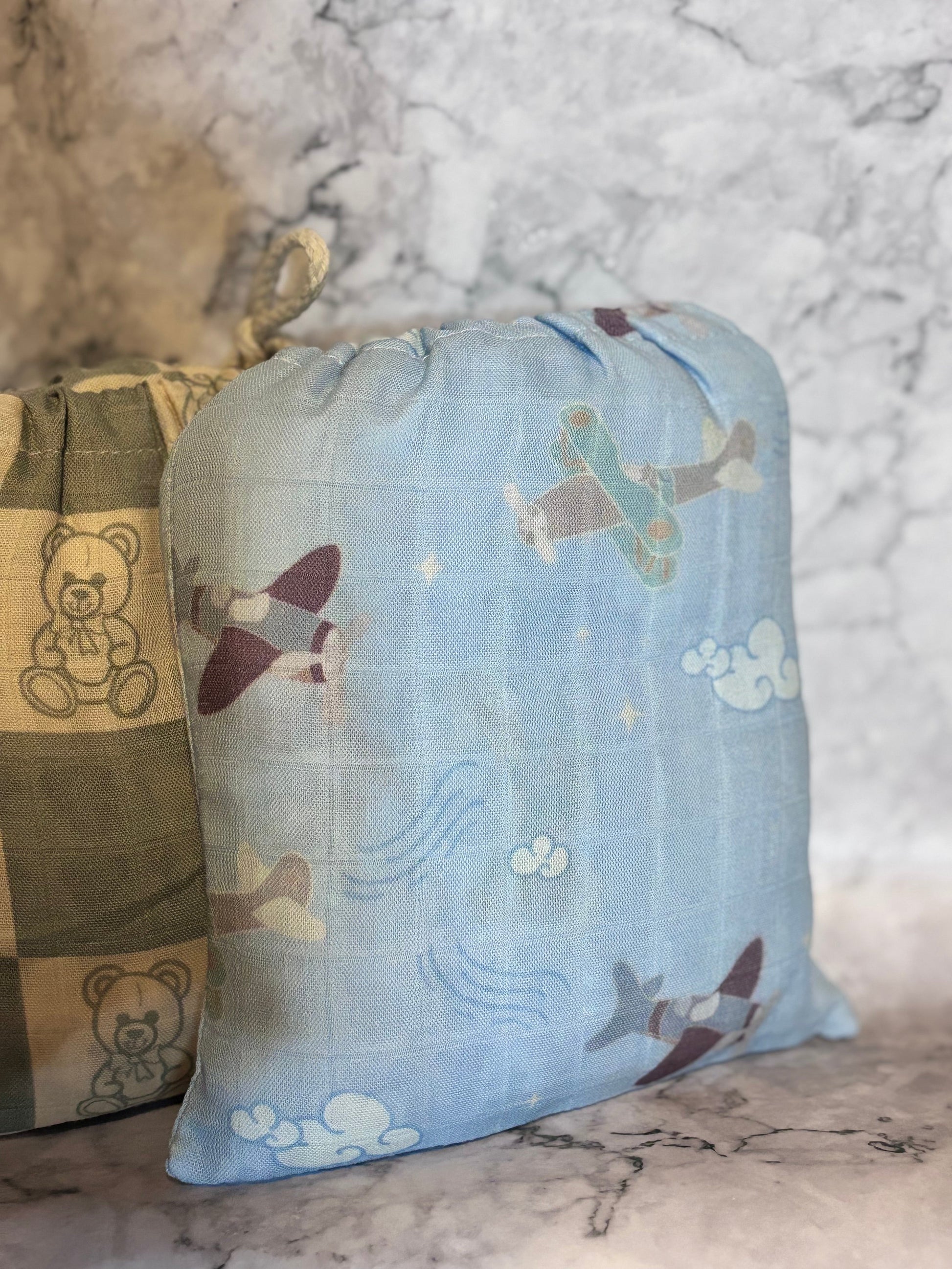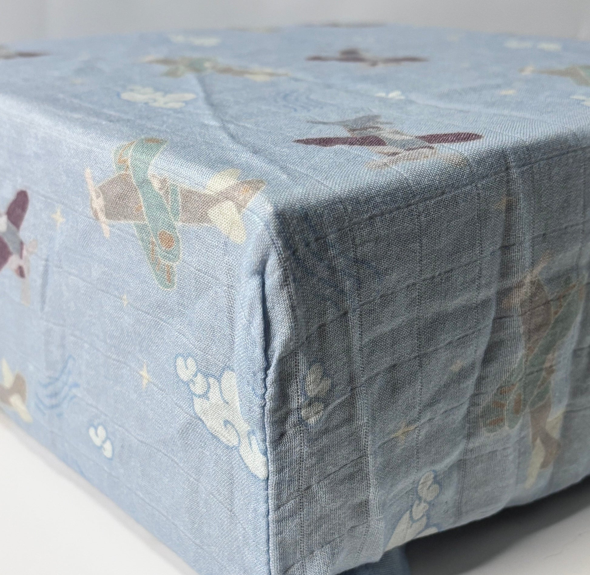 Add a little lift to your nursery with this sky-high essential. Whether you're creating a travel-themed space or just love a nostalgic airplane motif, this bamboo muslin crib sheet brings both charm and comfort to bedtime.