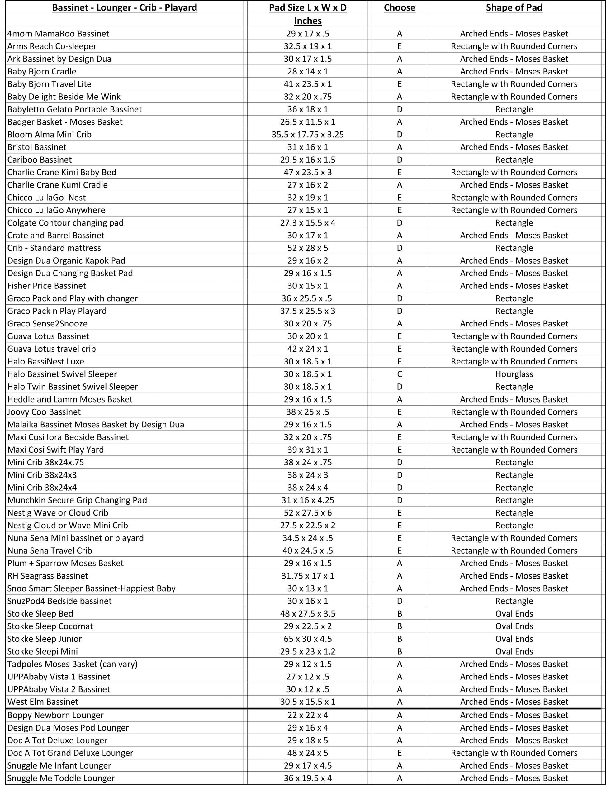Our custom size and shape fit a number of different items, including: Moses baskets, bassinets, cradles and cribs. Take a look at the list of brands and models to fit your mattress pad just right!
