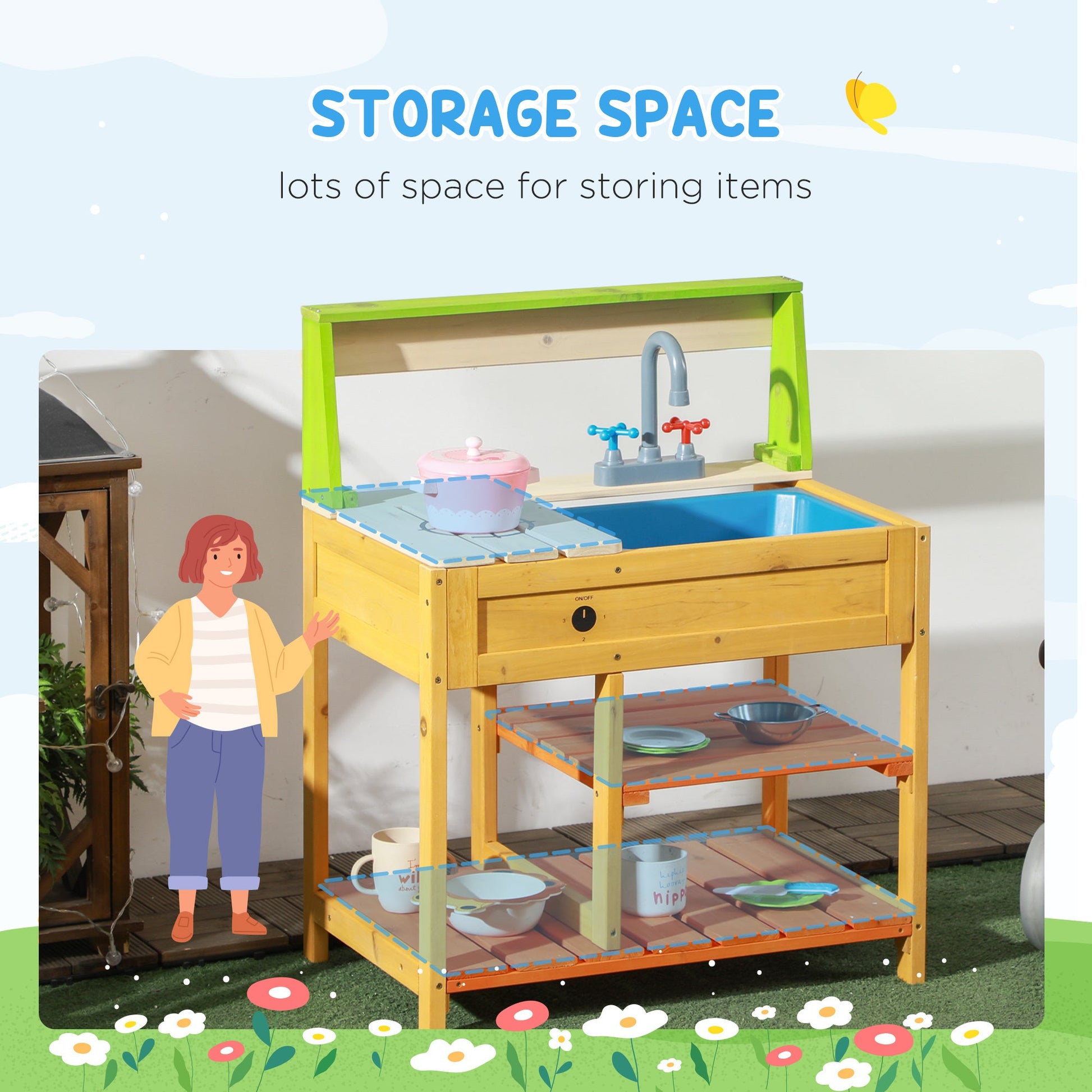 Outsunny Mud Kitchen Outdoor Kitchen Playset for Kids Wooden with Realistic Play Kitchen Toys, Faucet and Sink, Storage Shelves, Gift for Girls and Boys Aged 3-8 Years Old