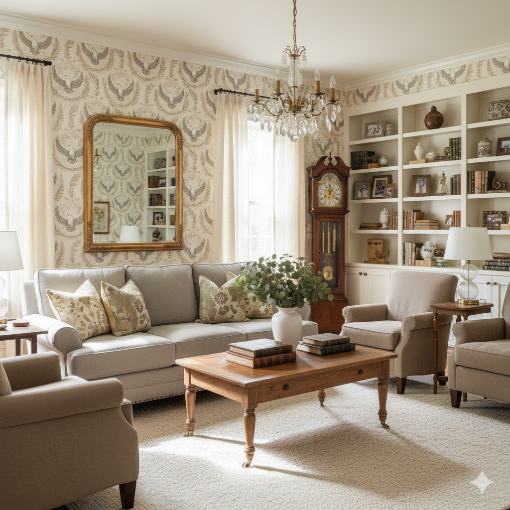 Softly sketched doves with outstretched wings are framed within laurel wreaths and delicate floral circles on a warm parchment ground. Rendered in sepia and ivory tones, the design feels timeless, symbolic, and serene. The repeated circular motif creates balance and rhythm, while the doves evoke themes of peace, spirituality, and renewal. Ideal for heritage homes, meditation spaces, or nurseries, this wallpaper adds a calming, elegant touch. Its neutral palette makes it easy to pair with antique furniture, natural linens, or light-toned woods.