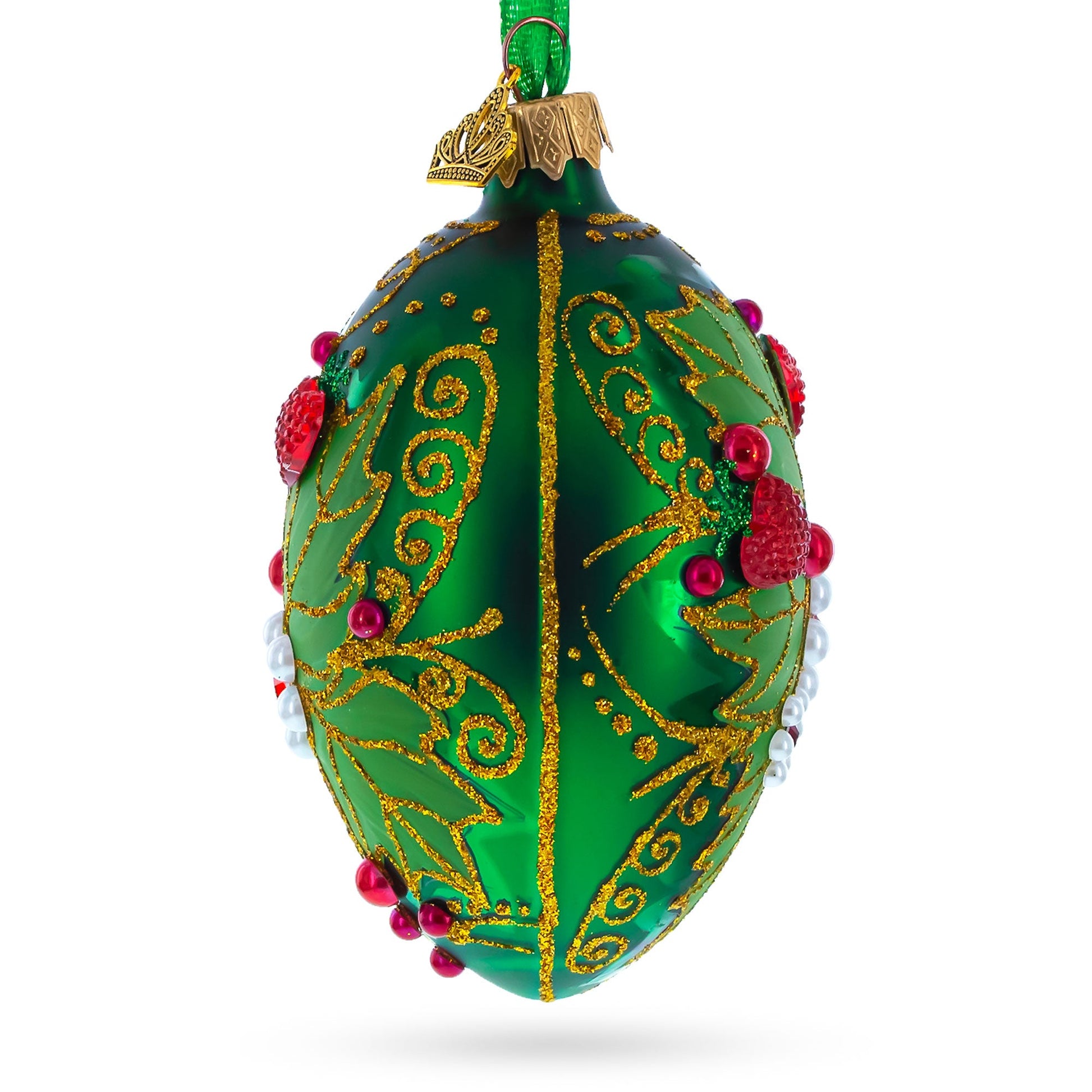 Pearl on Green Leaves Glass Egg Ornament 4 Inches