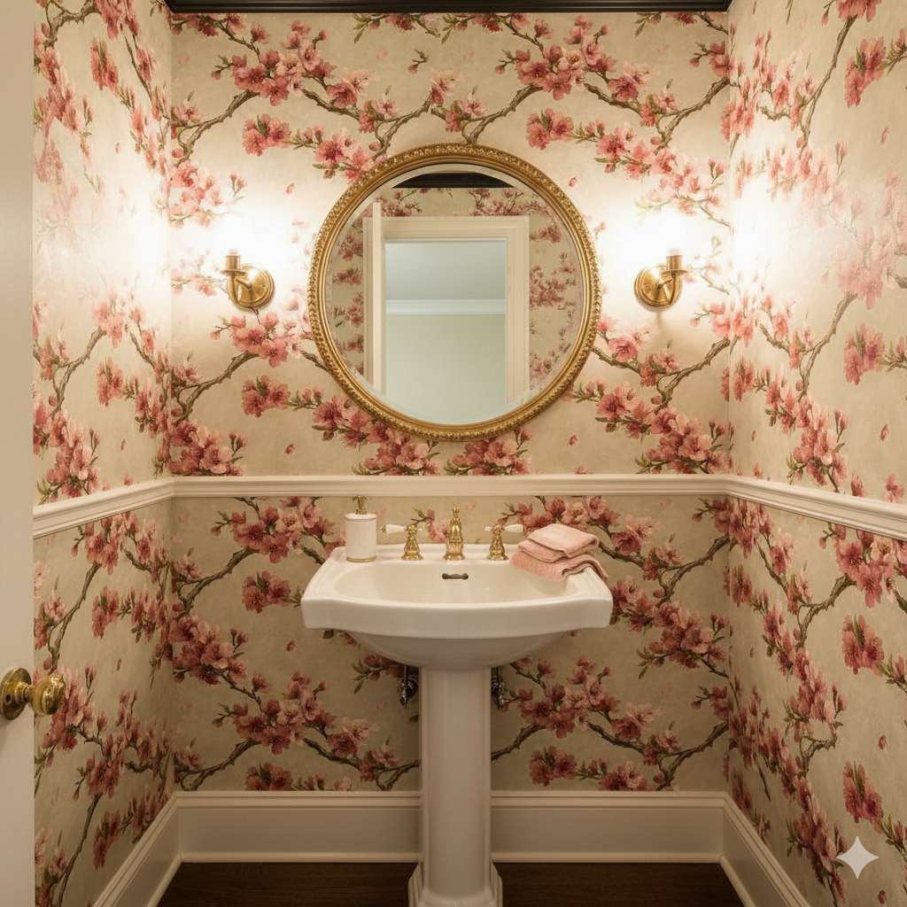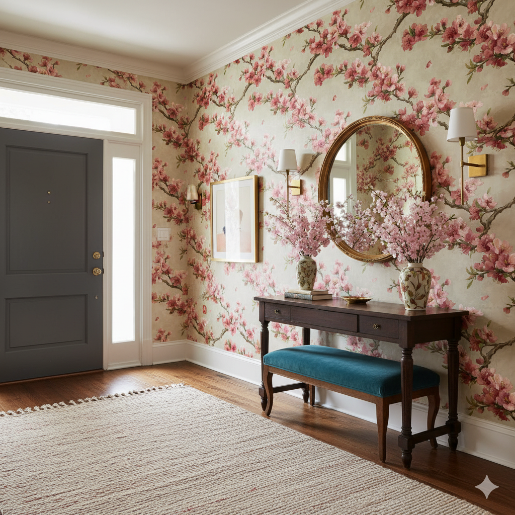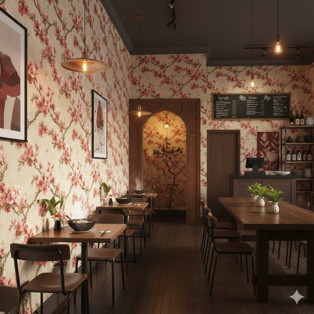Bold coral-pink blossoms cluster like glowing lanterns on twisting branches, painted with rich, expressive brushstrokes. The taupe backdrop allows the florals to radiate warmth, making this wallpaper perfect for romantic bedrooms, garden-inspired dining rooms, or boutique spaces seeking a fresh springtime glow.