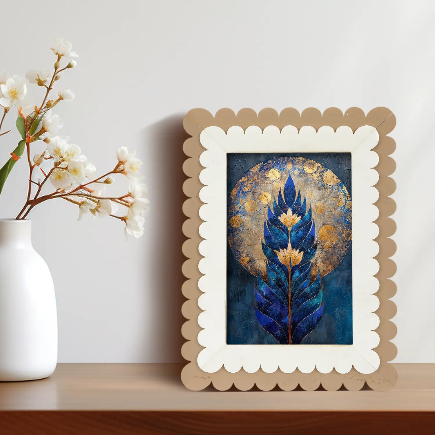 With its eye-catching scalloped edge and warm neutral tones, this decorative photo frame fits effortlessly into a range of interior styles—whether it's rustic farmhouse, cozy boho, or clean contemporary. Ideal for tabletop use or wall display, it enhances any setting, from living room walls to office shelves, bedside tables, or entryway consoles.