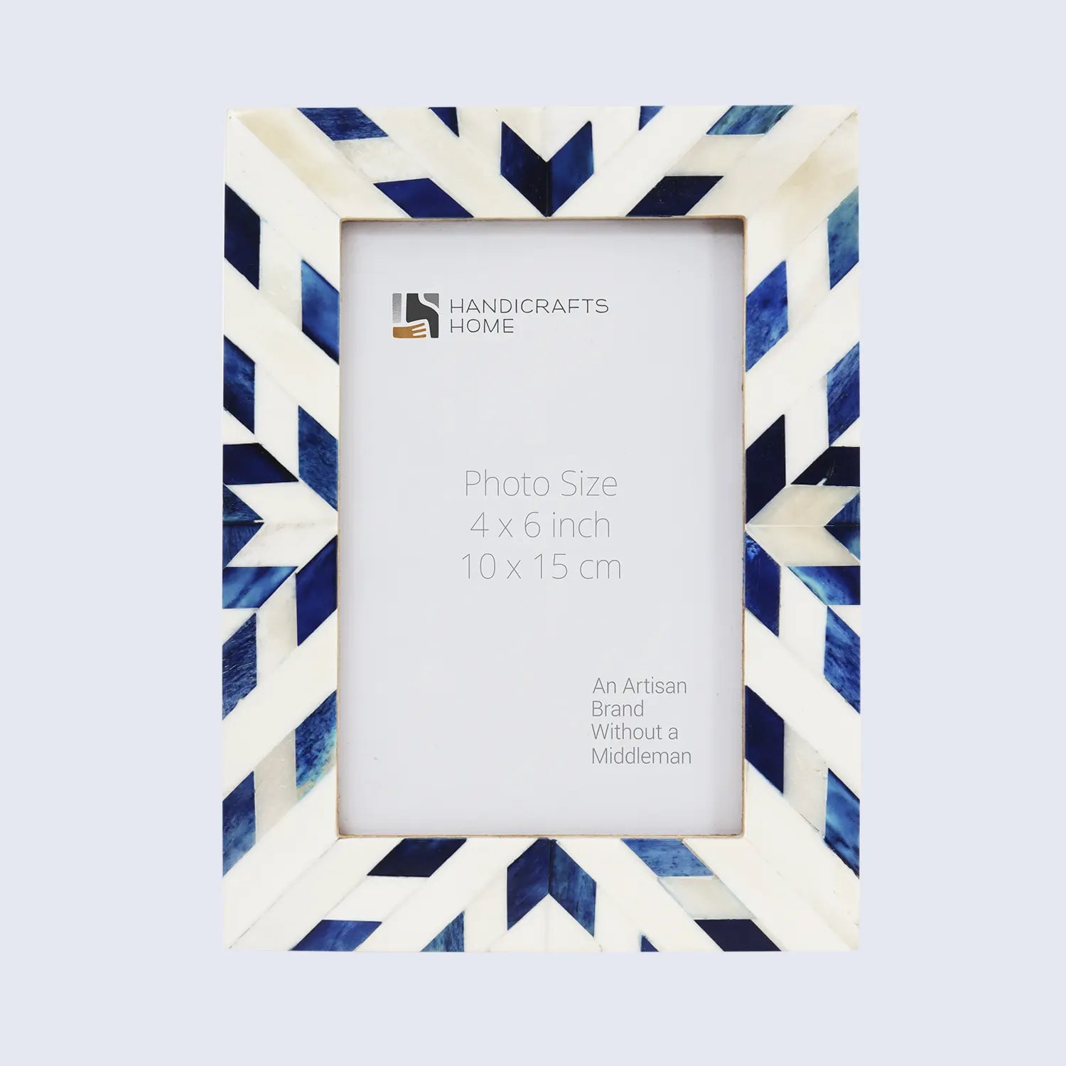 Handicrafts Home presents the Hypno Frost Bone Inlay Picture Frame, a handcrafted photo frame featuring a mesmerizing blue and white chevron pattern. Carefully designed with bone inlay and a sturdy pine MDF backing, this blue & white geometric artwork picture frame is a stylish and durable choice for home wall decor and office desk decor.