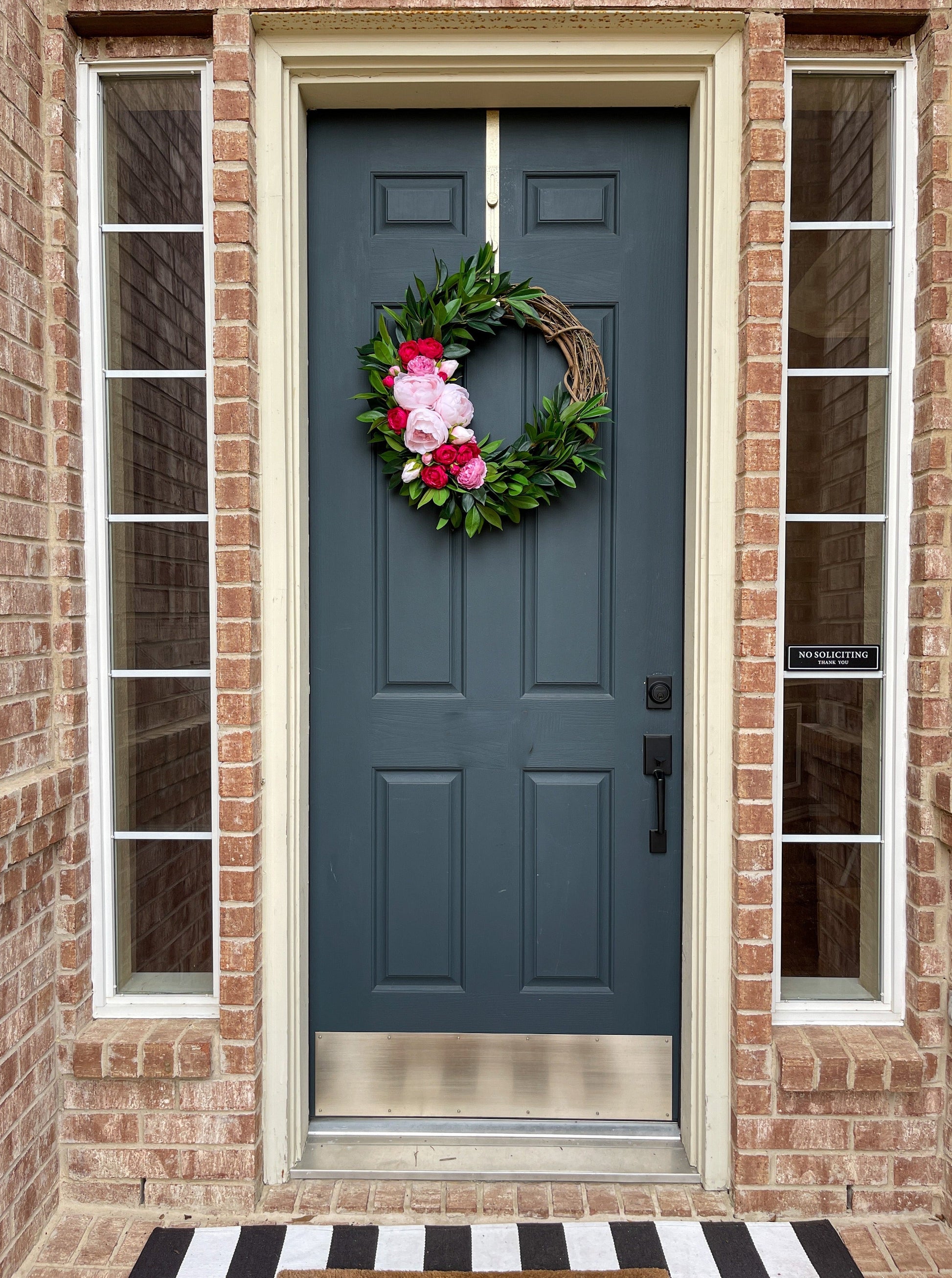 Brighten your front door with this peony & ranunculus wreath, perfect for spring and summer! This pink summer wreath has been handcrafted on a grapevine base and trimmed with peonies and ranunculus in various shades of pink, set against a bed of lush greenery. Also fabulous as a housewarming or birthday gift!