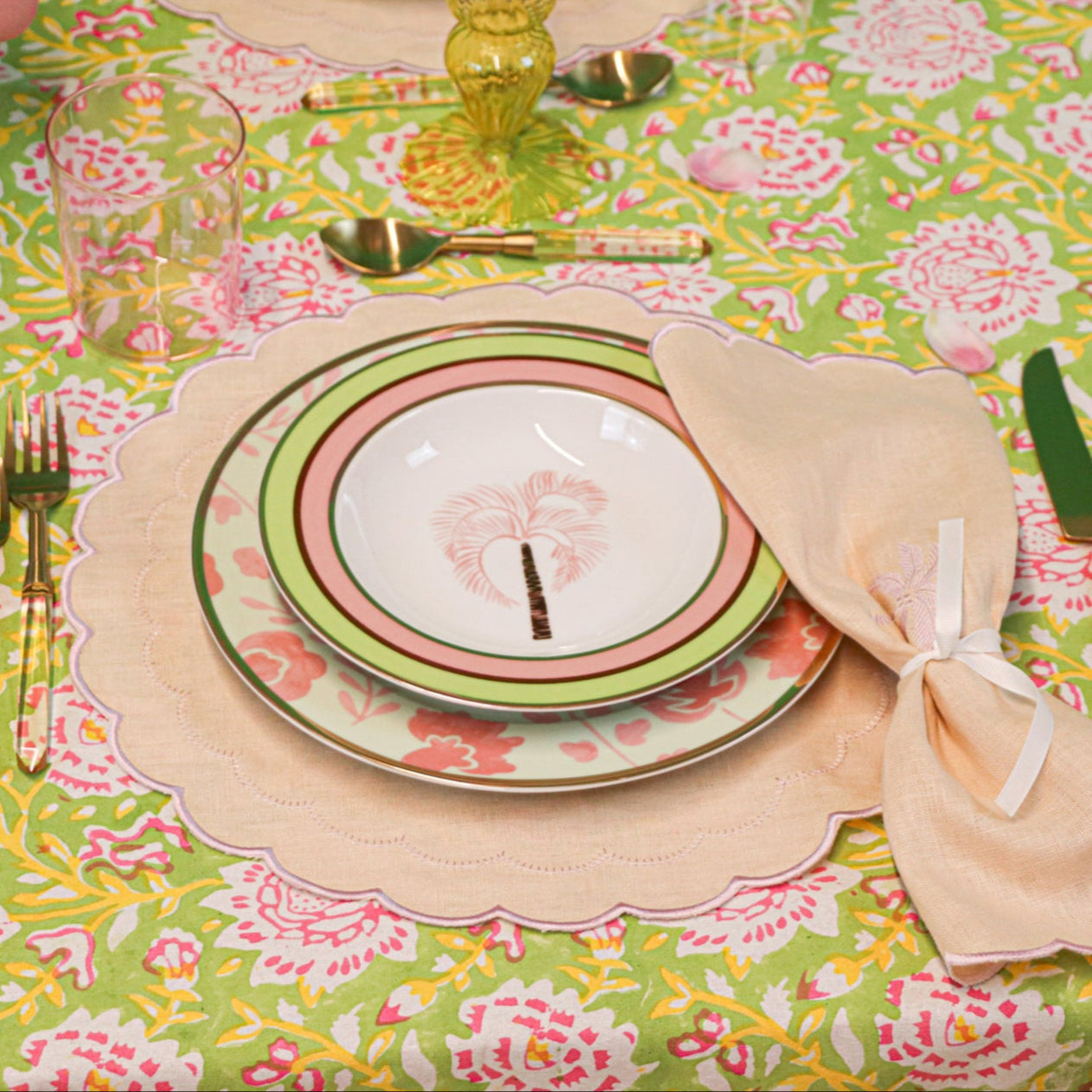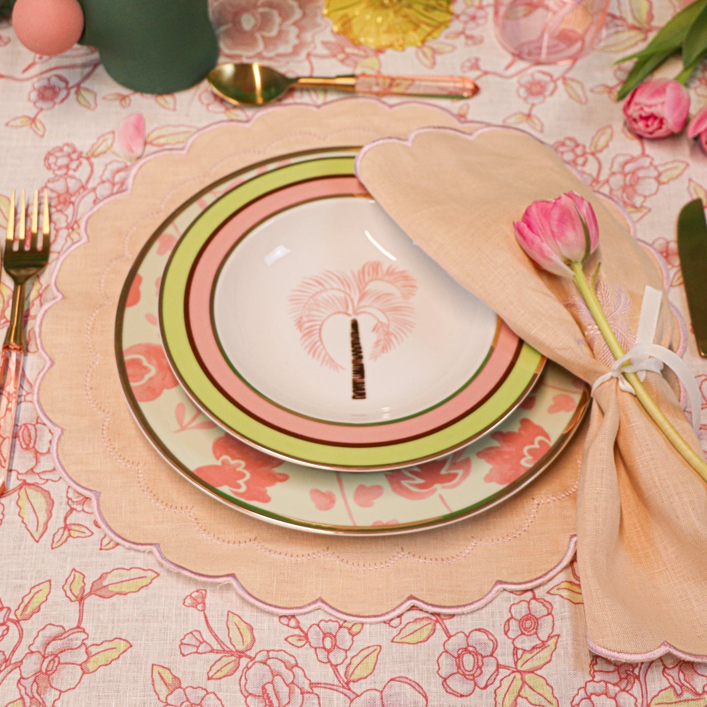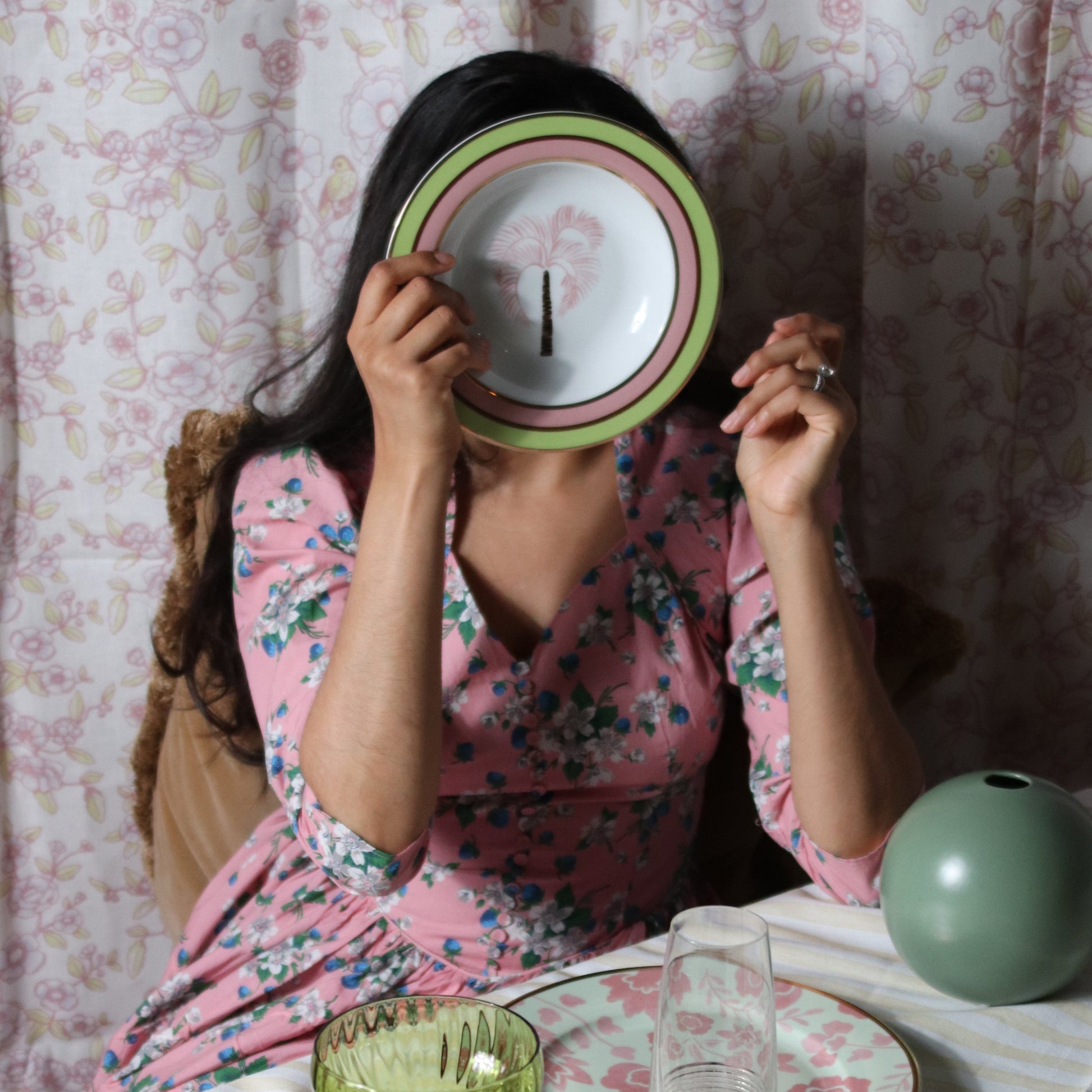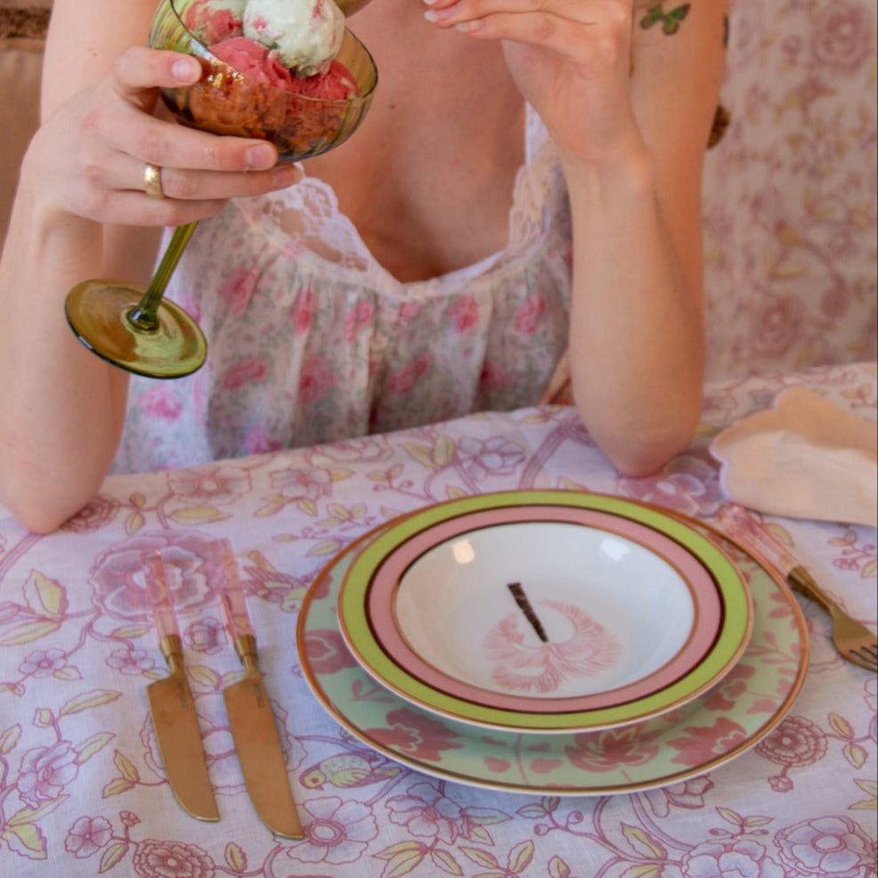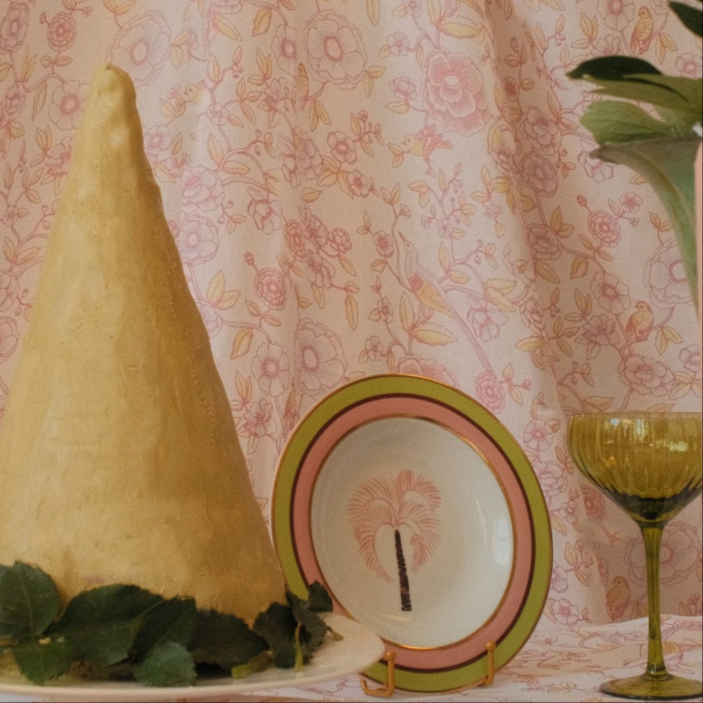 Dive into a dreamscape of yesteryears every time you indulge in your favorite soup or pasta. This bowl boasts a hand-painted blush palm tree and chocolate brown stem, intricately illustrated as if swaying with the breeze. Gold outer rim complemented by inner rings of pistachio, blush, and chocolate brown encircle the bowl edge. Designed for the contemporary soul who cherishes throwback aesthetics.