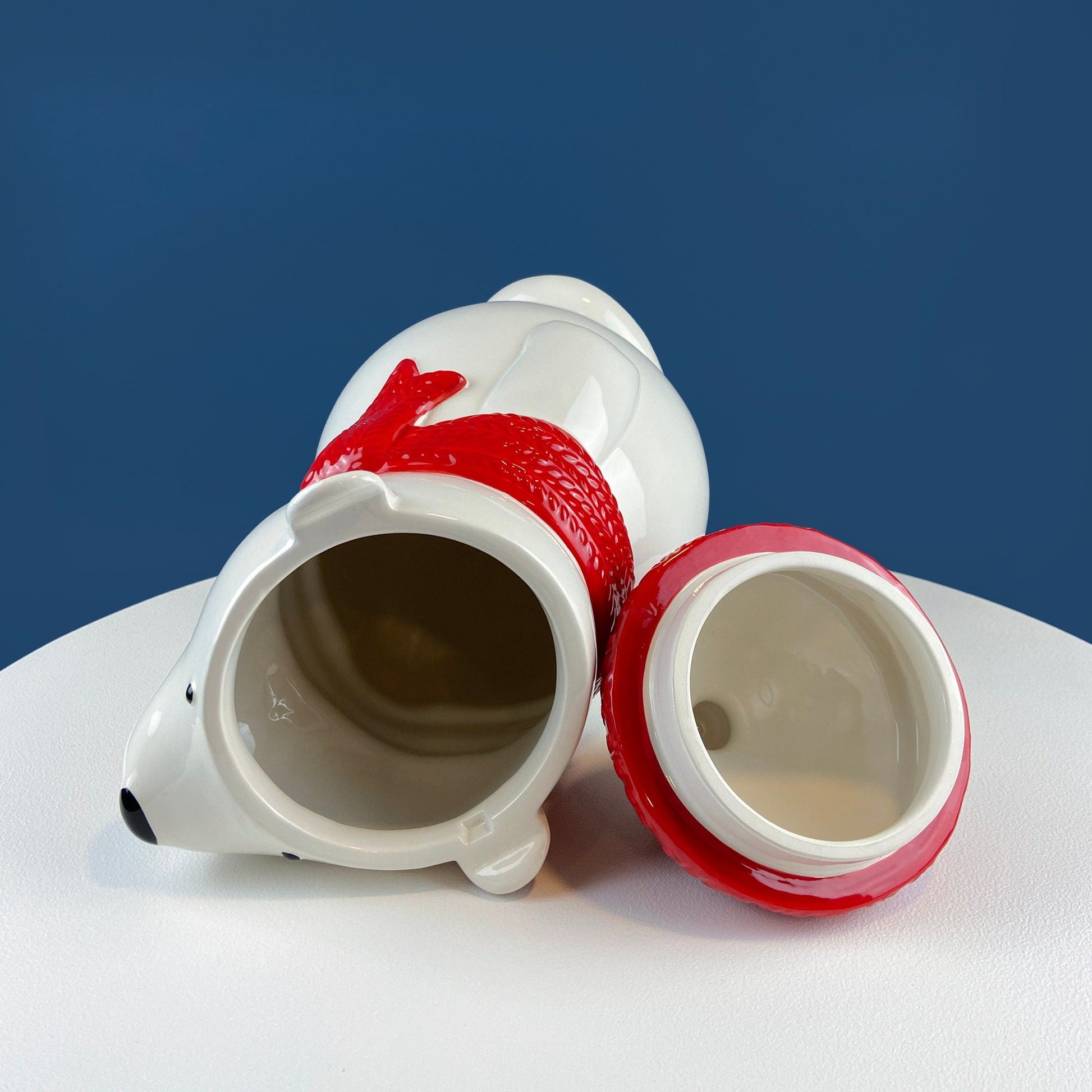 Polar Bear in Red Hat Cookie Jar. Cute, Animal Themed Kitchen Storage Canister or Kids' Room Decor. Holiday Dining Room Decor.