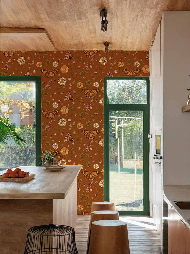 Bring vibrant energy to your space with our Poppy Please Wallpaper in stunning mustard and pink! This eye-catching design, illustrated by Samantha Santana herself, celebrates the beauty of monarch butterflies, moths, and California's gorgeous blooms. Available in both peel-and-stick vinyl and traditional pasted options, it's super easy to install. The best part? It's completely removable, making it perfect for renters or design enthusiasts who love to switch things up!