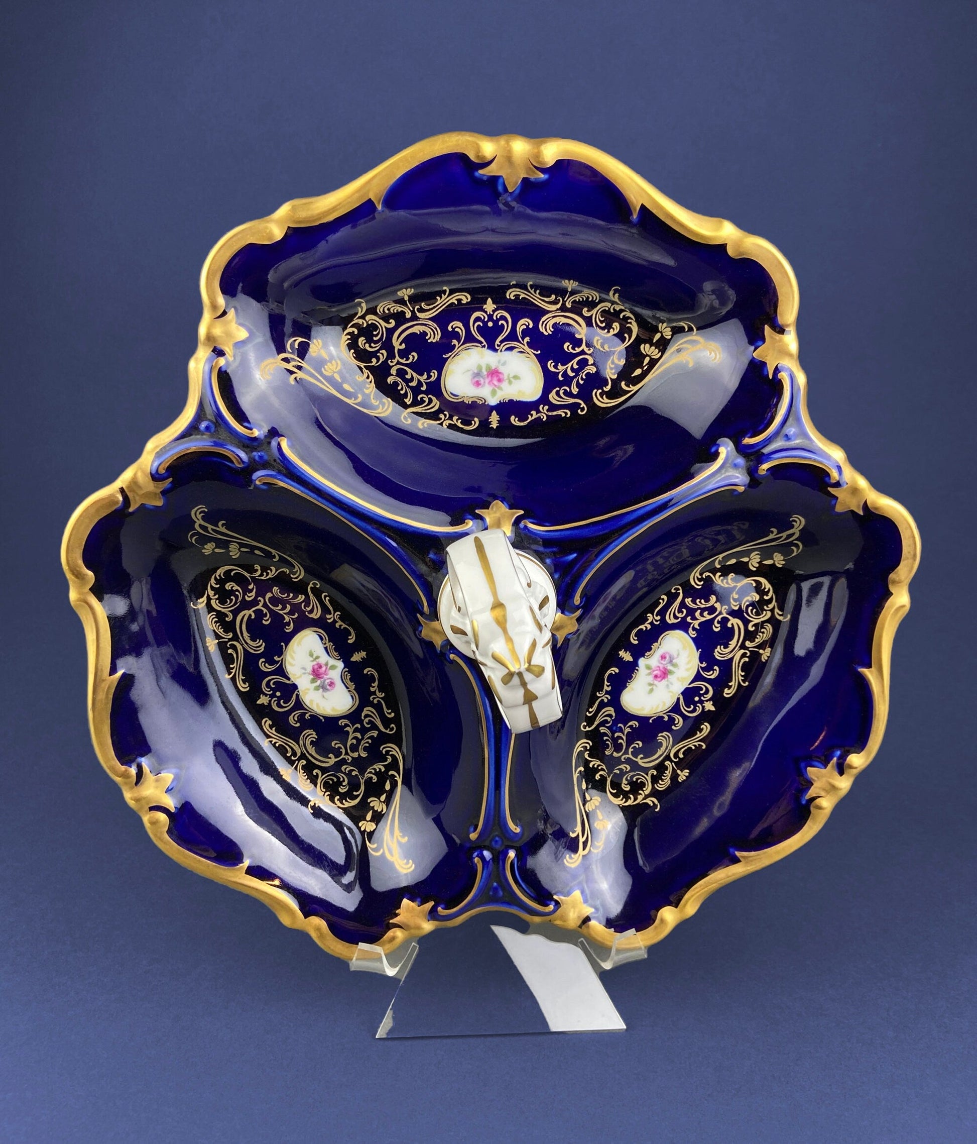 Porcelain Divided Bowl with Handle, Decorated with Three Different Hand Painted Landscapes. Antique Rare Collectible Art Dish.