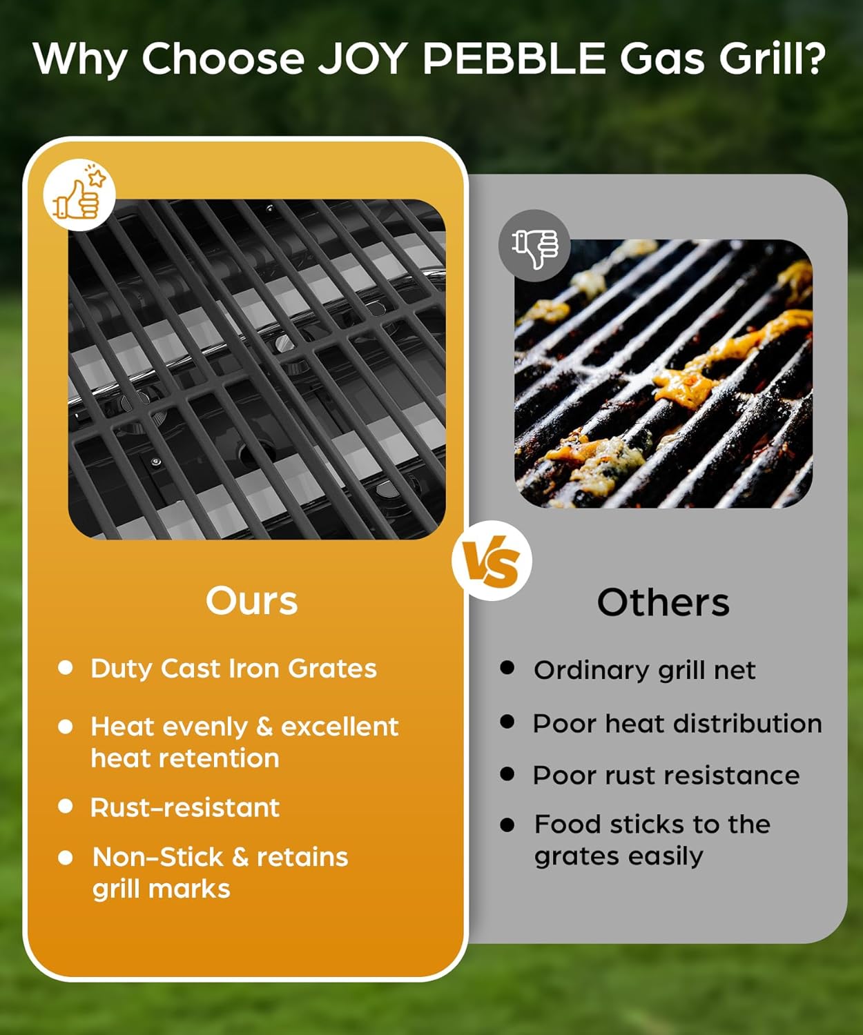 - [ Large Cooking Areas ] With a 348 square inches cooking area fits up to 15 burgers or 20 sausages. It is the perfect size for BBQ parties or everyday family BBQs. Heavy-duty cast iron grate mesh is not easy to rust, peel off, or bend, but also can make beautiful sear marks on the steak. Gas grill is also non-stick and easy to clean.