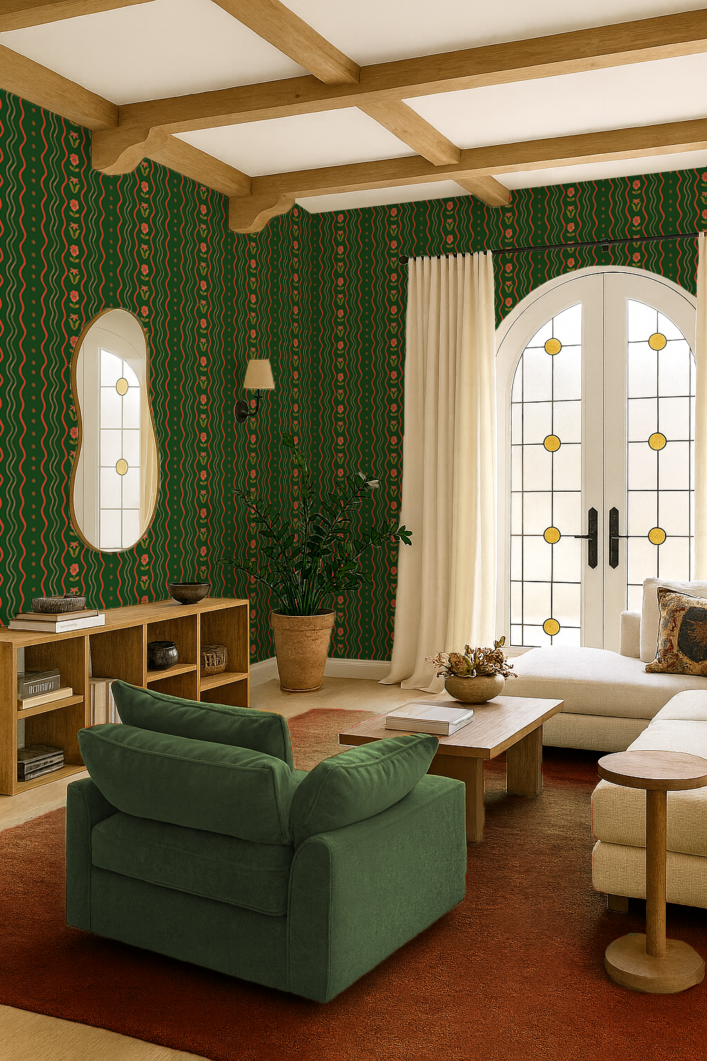 Add a fresh spin on cottage-core decor with the Posy Lane Stripe Wallpaper in dark green and poppy red, beautifully illustrated by Samantha Santana. Featuring a delightful mix of florals and wavy stripes, this wallpaper brings charm and personality to any space. Choose between easy peel-and-stick vinyl or smooth traditional pasted application for a hassle-free install. Plus, it’s completely removable, making it perfect for those who love to refresh their style often.