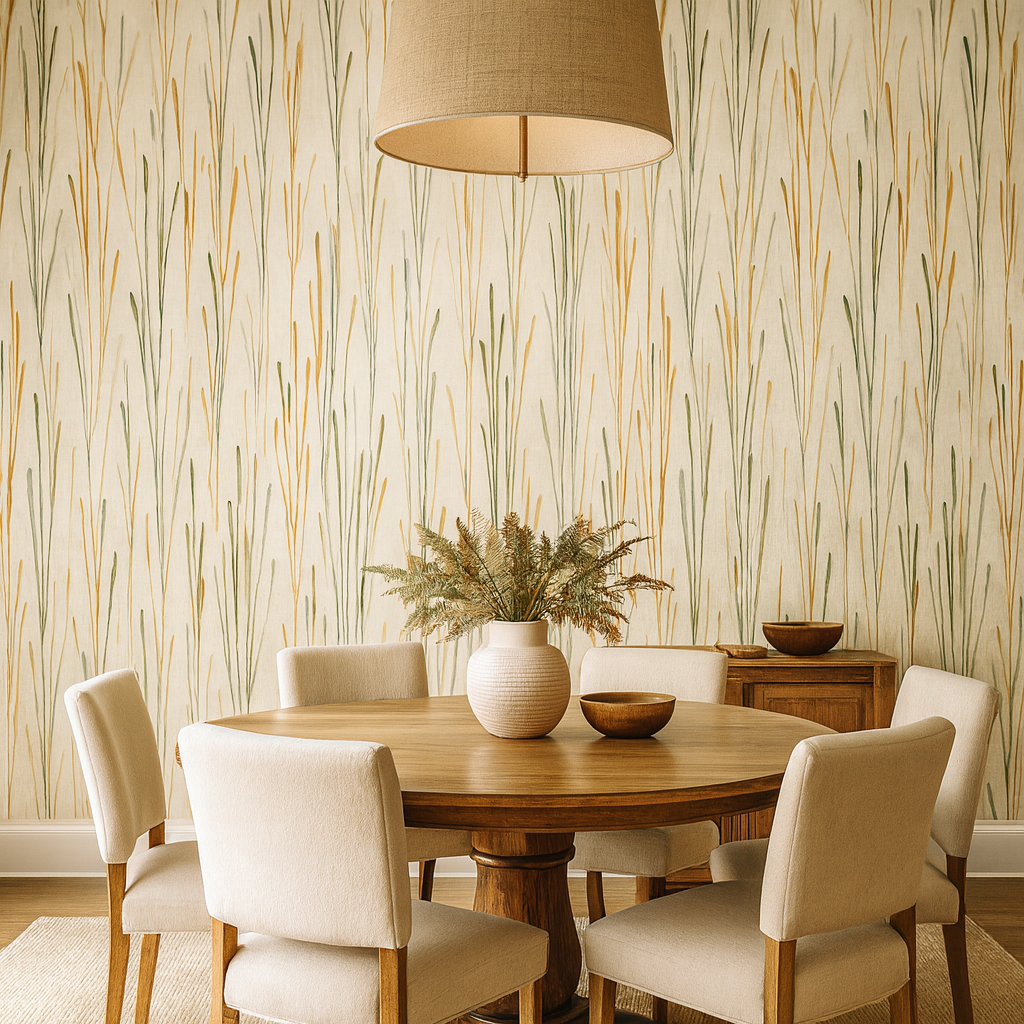Slender stalks of prairie grasses rise vertically against a light neutral ground, swaying in watercolor tones of ochre, olive, and soft sage. There is a quiet elegance in the negative space, giving rooms a sense of lightness and breath. The design pairs beautifully with both contemporary minimalist interiors and farmhouse styles, balancing natural movement with refined restraint. It’s particularly suited for bedrooms, sunrooms, or entryways where a touch of the outdoors brings calm and harmony indoors. The palette makes it versatile — golden tones warm up modern neutrals, while green accents nod to naturalist living.