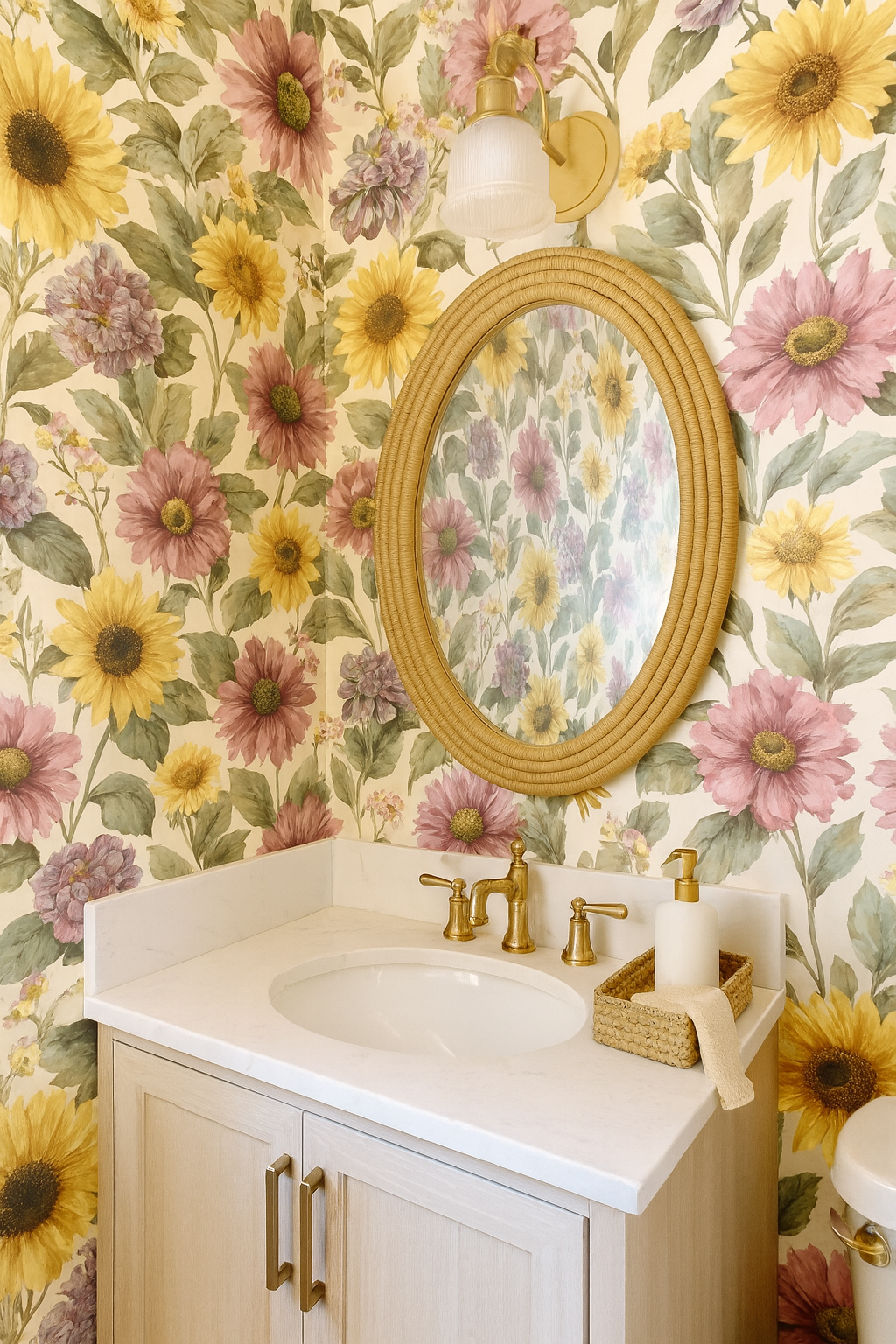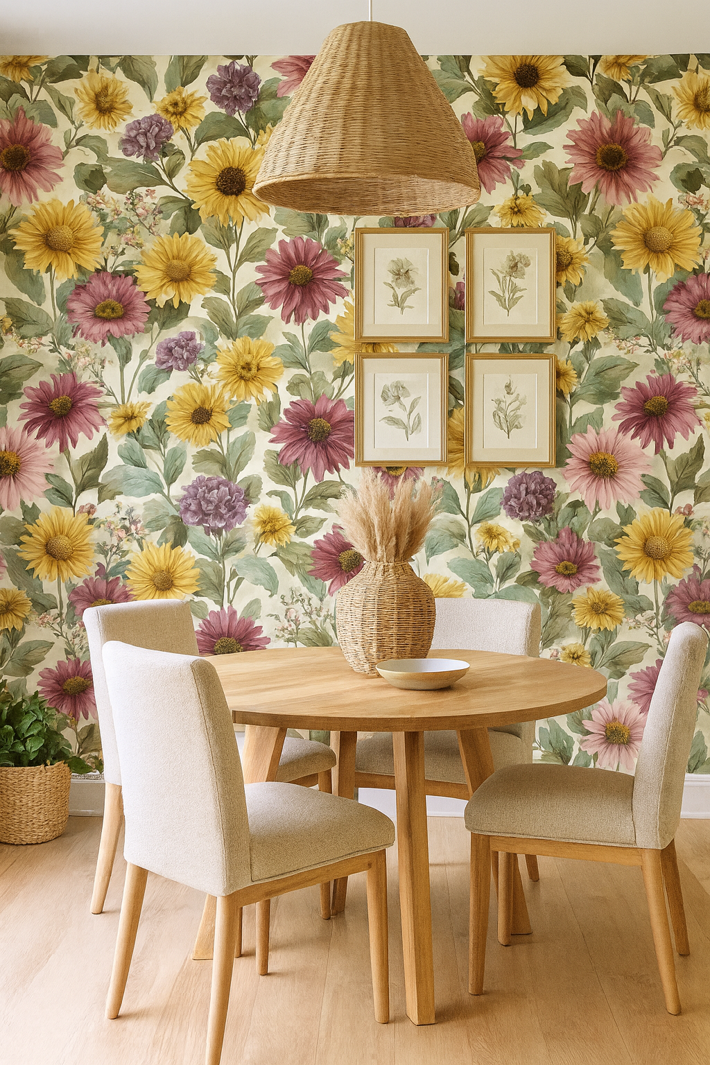A botanical daydream bursting with summer’s untamed joy. Golden black-eyed Susans, raspberry-hued coneflowers, and pops of purple wildflowers bloom in bold, painterly strokes across a soft cream base. Leaves in dusty sage ground the brightness for a rich but livable floral repeat. This one breathes warmth and optimism—perfect for kitchens, sunrooms, or farmhouse-chic apparel.