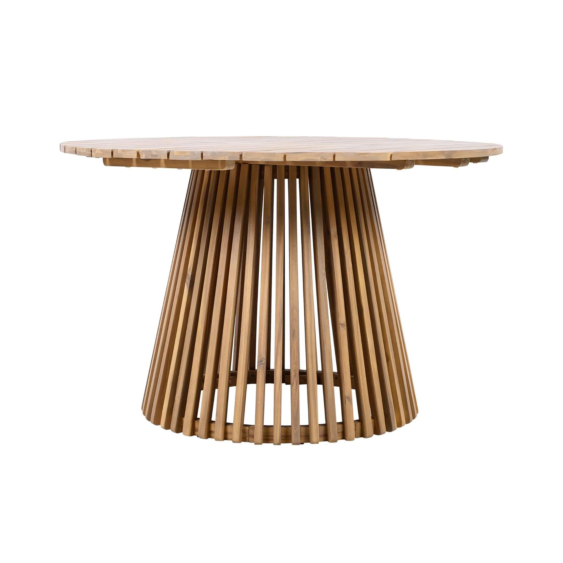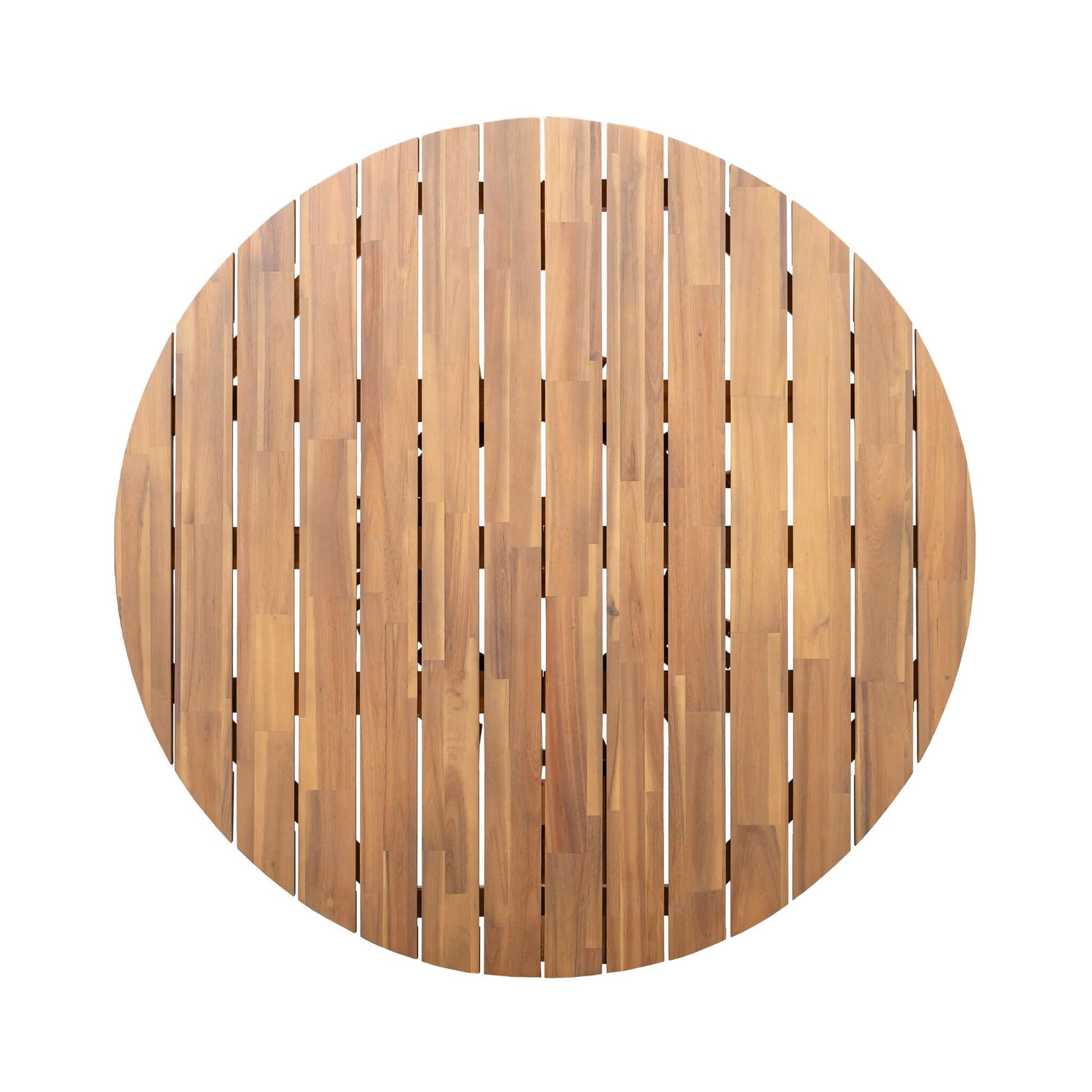 - A 47.25-inch circular Acacia wood tabletop with a unique slatted base for stability and style, holding up to 300 lbs.