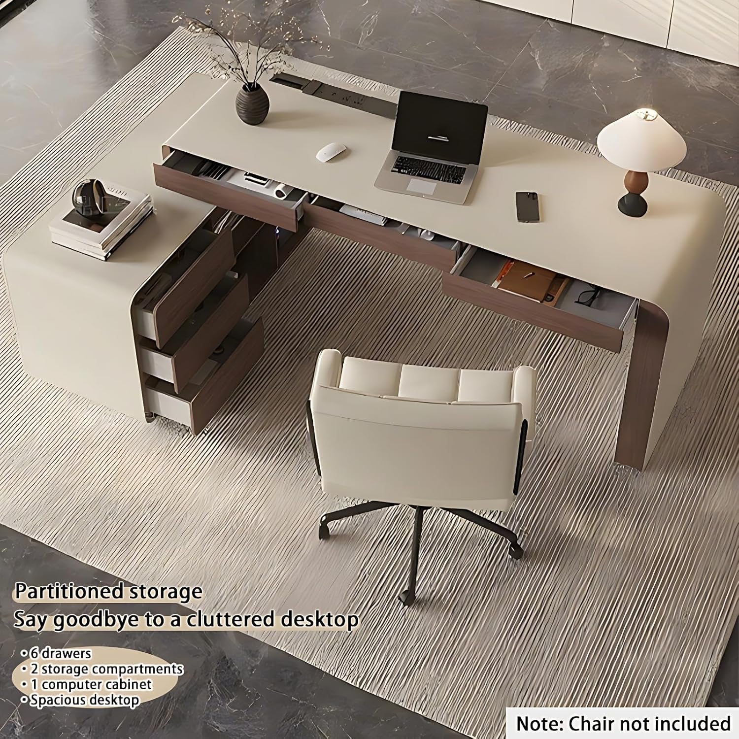 - Large-capacity storage with 6 soft-close drawers, 2 side compartments, and a dedicated host cabinet to keep documents and tech neatly tucked away.