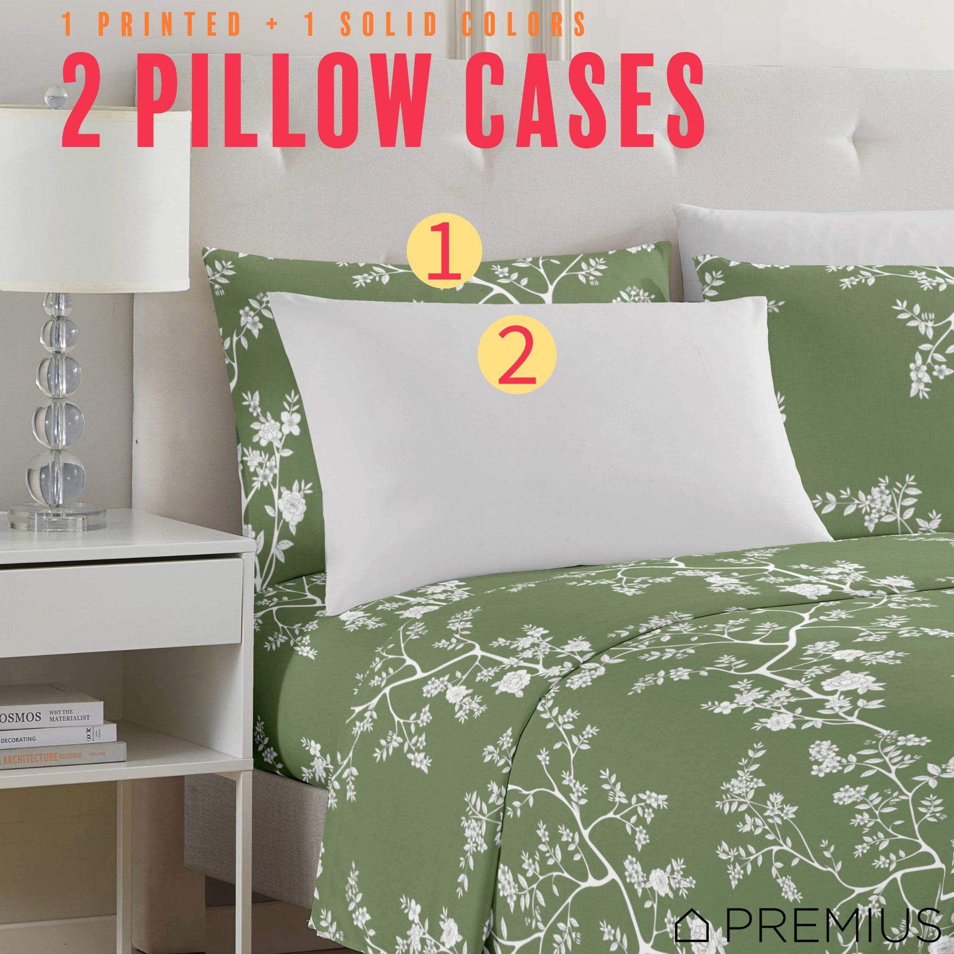 - Set Includes: 1 Flat Sheet, 1 Fitted Sheet, 2 Floral Printed Pillowcases, 2 Solid Color Pillowcases
