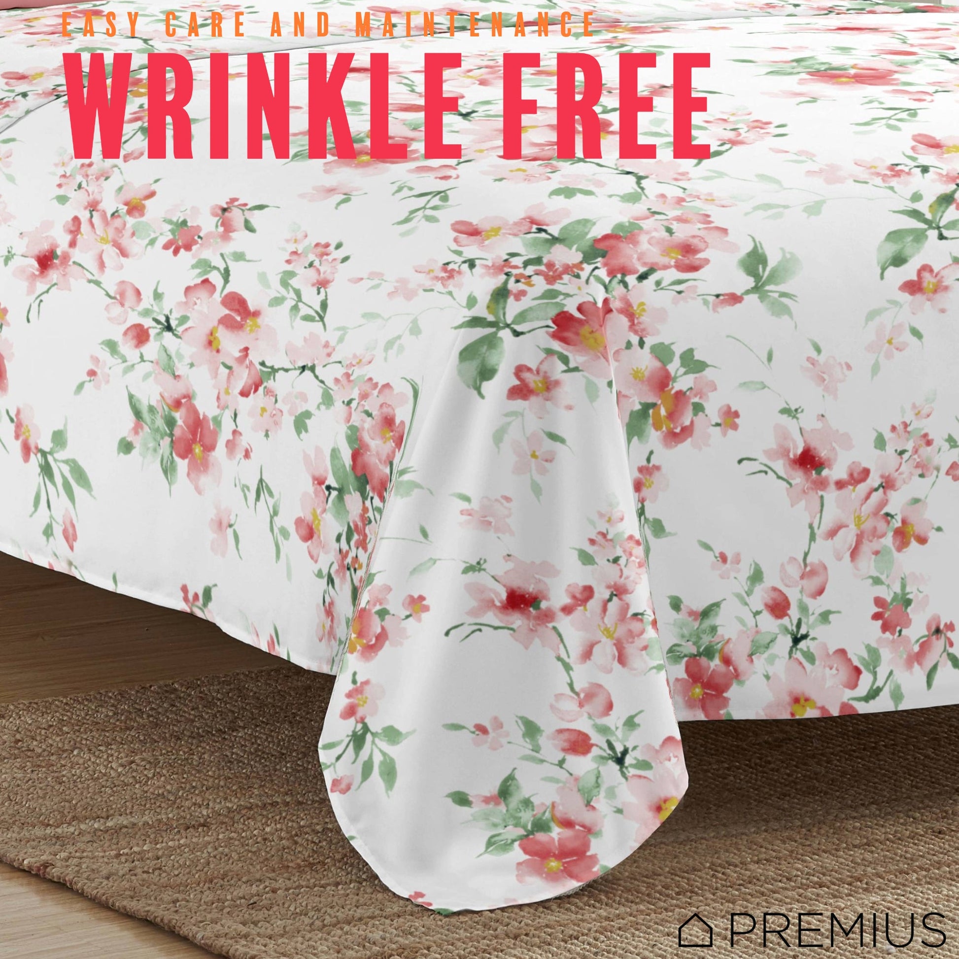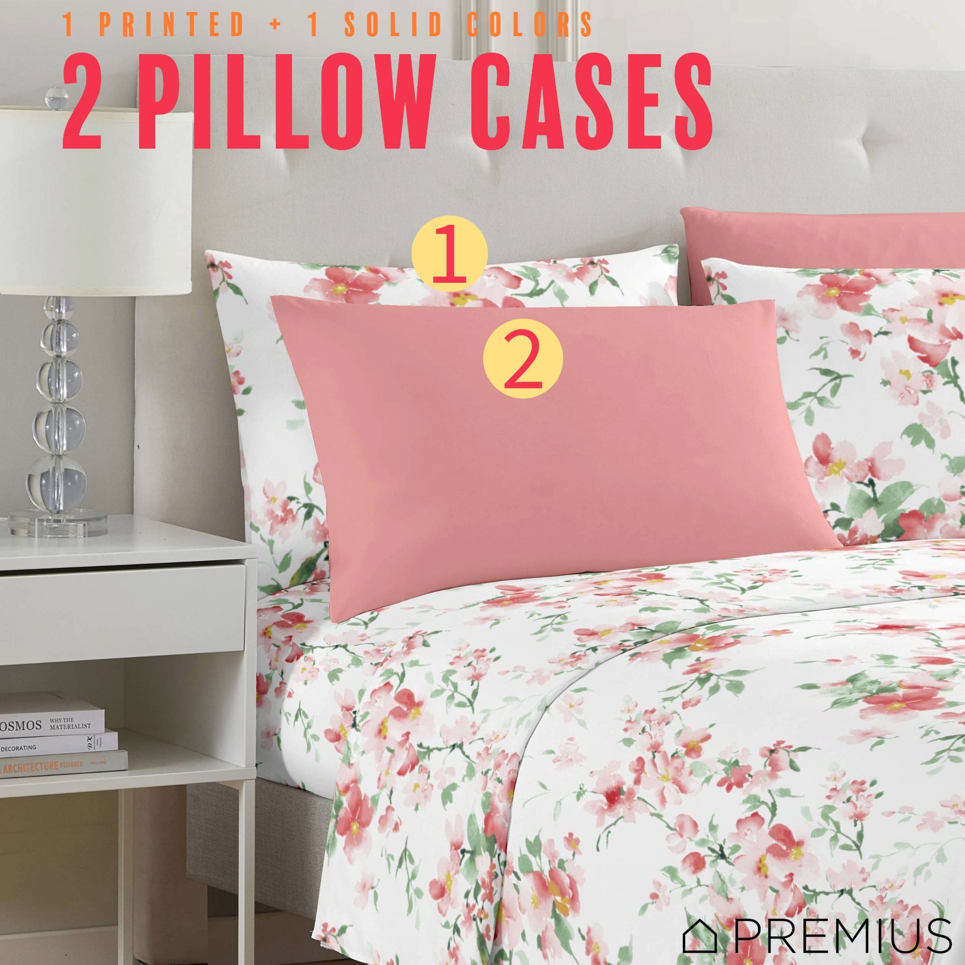 Transform your bedroom into a blooming oasis with the PREMIUS Jennifer 4-6 Piece Floral Wrinkle-Free Sheet Set. Its Soft Microfiber 100% Polyester Fabric gives your tired sleep the comfort level of peace and a fresh wake-up. Comes with a Floral Pattern of Pink Flowers and Green Leaves on a White Background giving a natural atmosphere and bringing the perfect piece of mind. Matching Pillowcases with a floral and solid background complete your sheet set with 14 Inches Deep Pocket fitted and flat sheets.