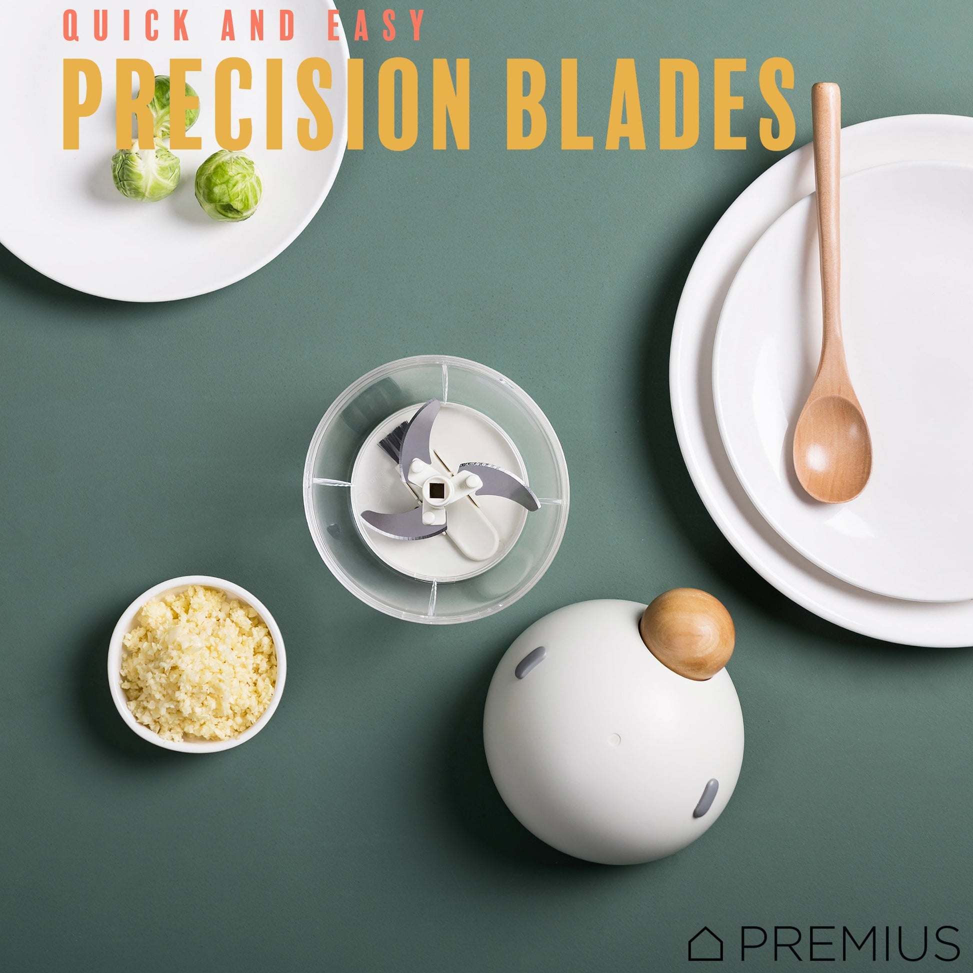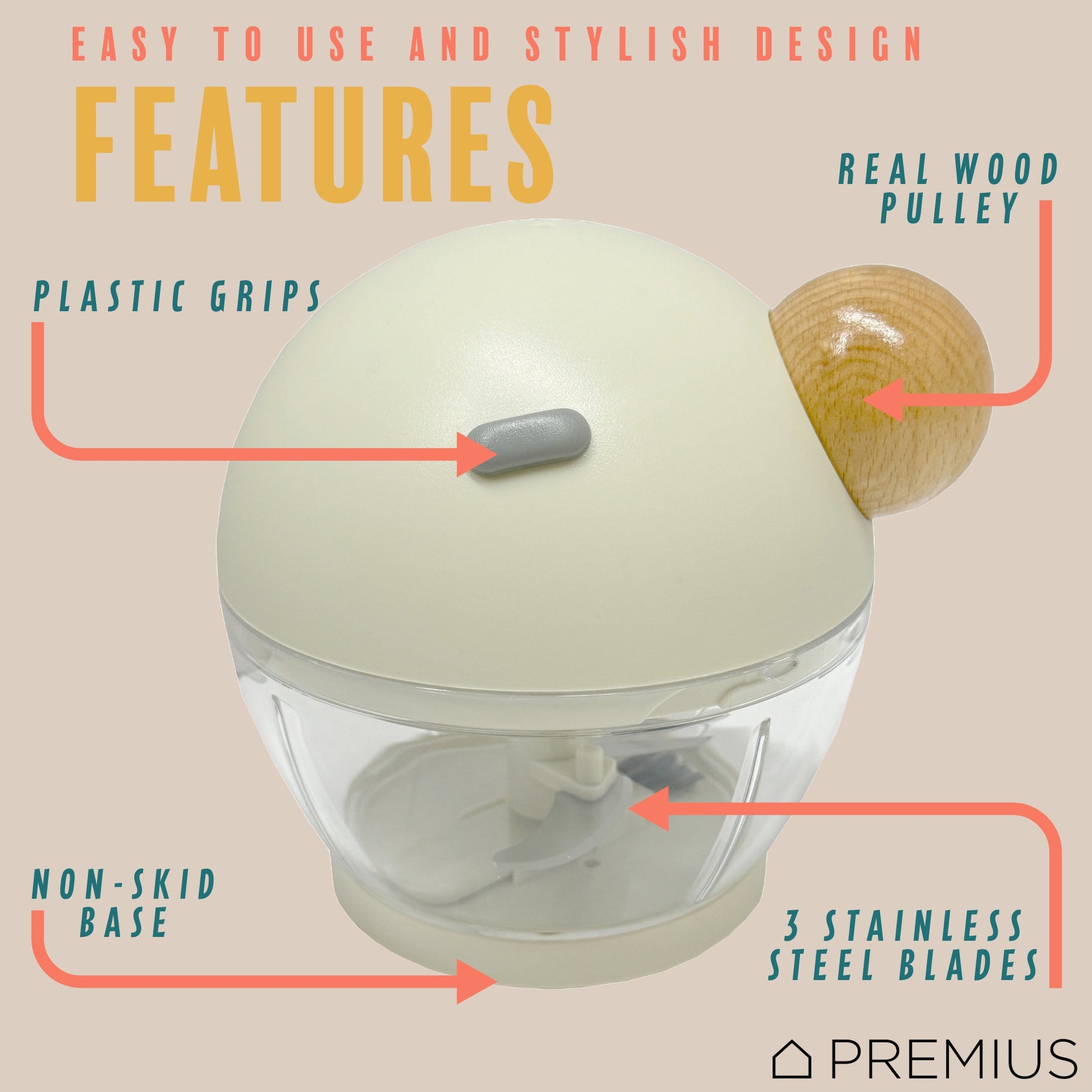 PREMIUS Manual Pull Hand Food Chopper, With Wood Ball, White-Natural, 1.5 Cups
