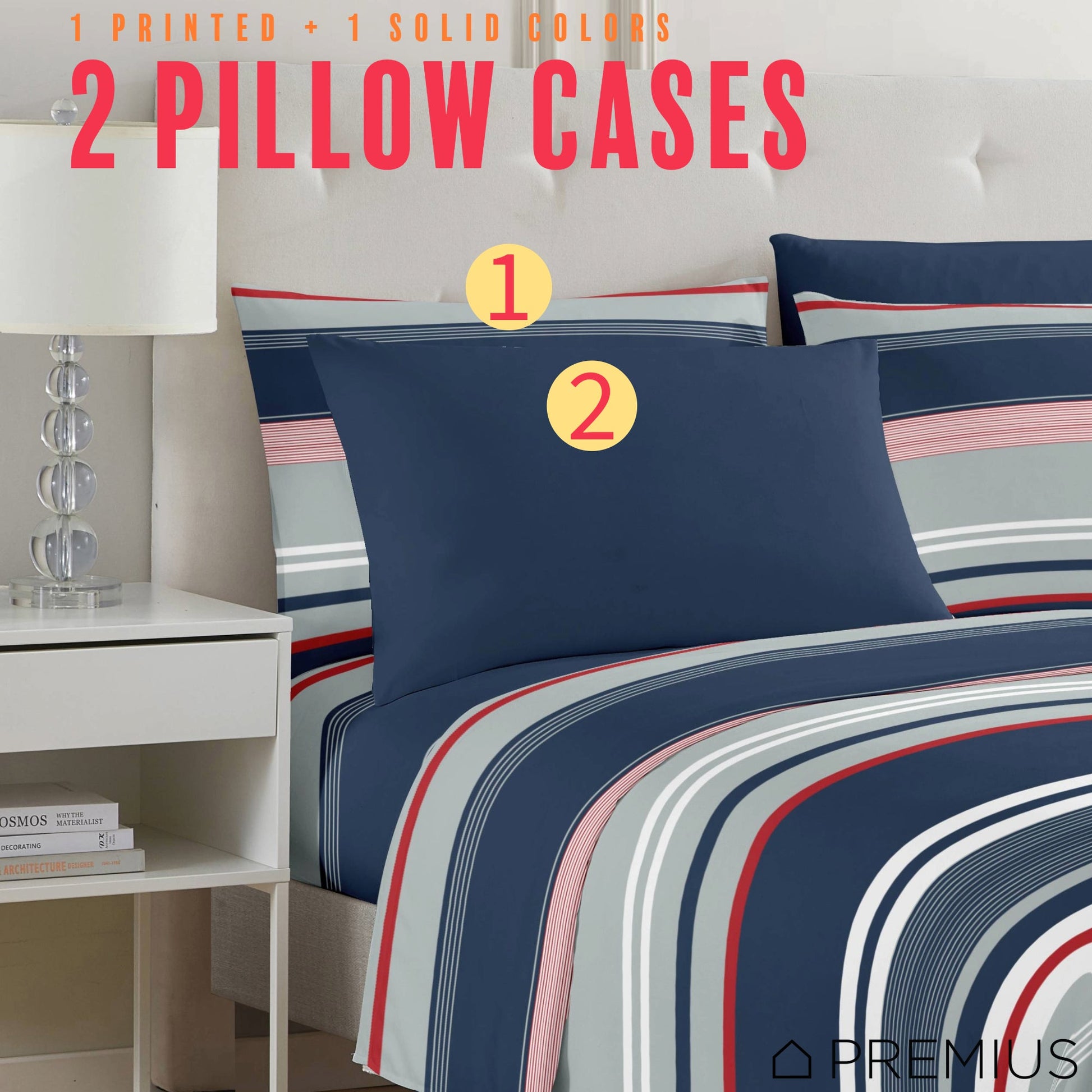 - Set Includes: 1 Flat Sheet, 1 Fitted Sheet, 2 Printed Pillowcases, 2 Solid Color Pillowcases