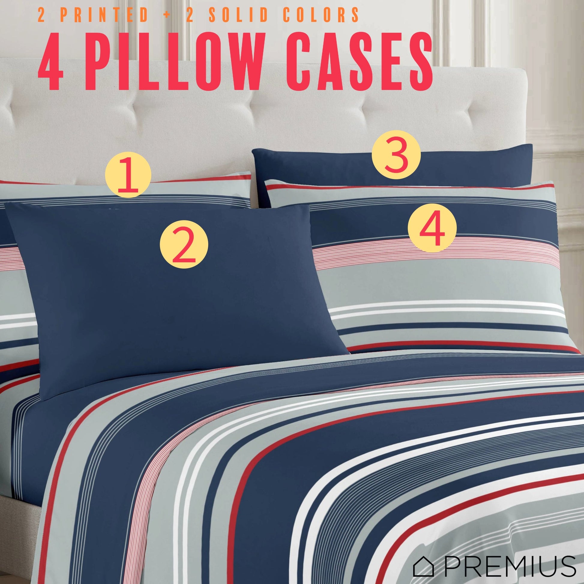 Wrap yourself in the ultimate luxury of cloud-like softness with the PREMIUS Mateo Sheet Set. Crafted from premium microfiber polyester, these sheets are not only exceptionally soft but also breathable and durable, promising a restful night's sleep. The bold, contemporary striped pattern in a vibrant palette of navy blue, gray, red, and white effortlessly transforms your bedroom into a stylish haven.