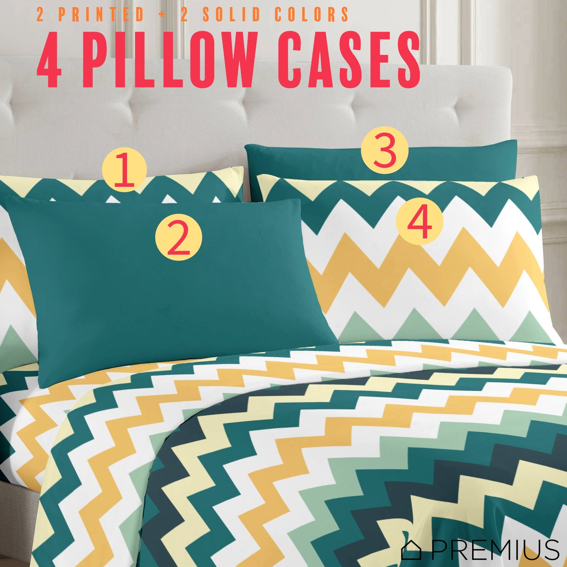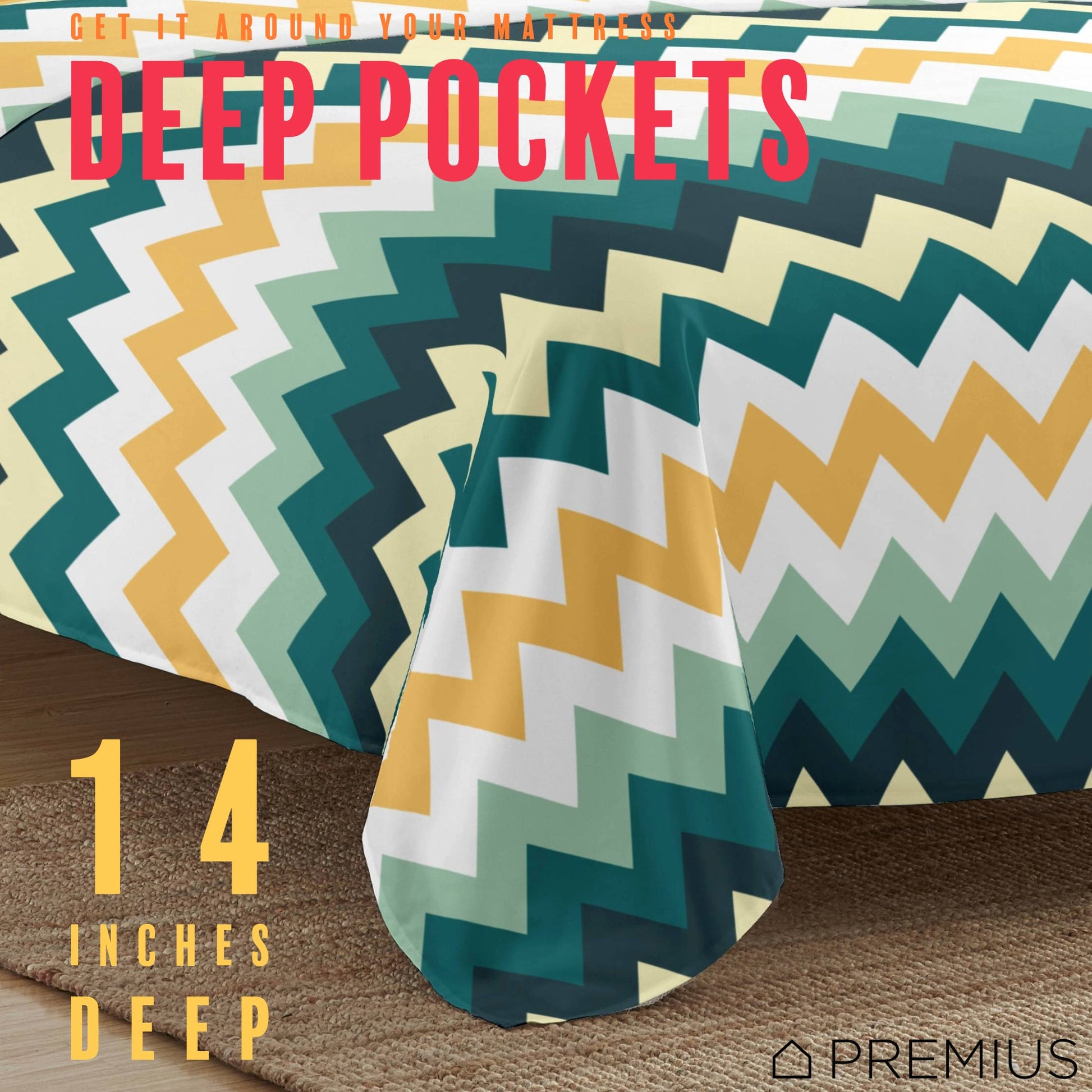 Say goodbye to wrinkles and hello to effortless style. This wrinkle-resistant set maintains a crisp appearance without the need for constant ironing. The deep pockets ensure a secure fit on mattresses up to 14 inches, keeping your bed looking neat and tidy. This six-piece set includes a flat sheet for a luxurious drape, a fitted sheet for a perfect fit, two printed pillowcases showcasing the bold chevron design, and two solid teal pillowcases for a touch of balance.