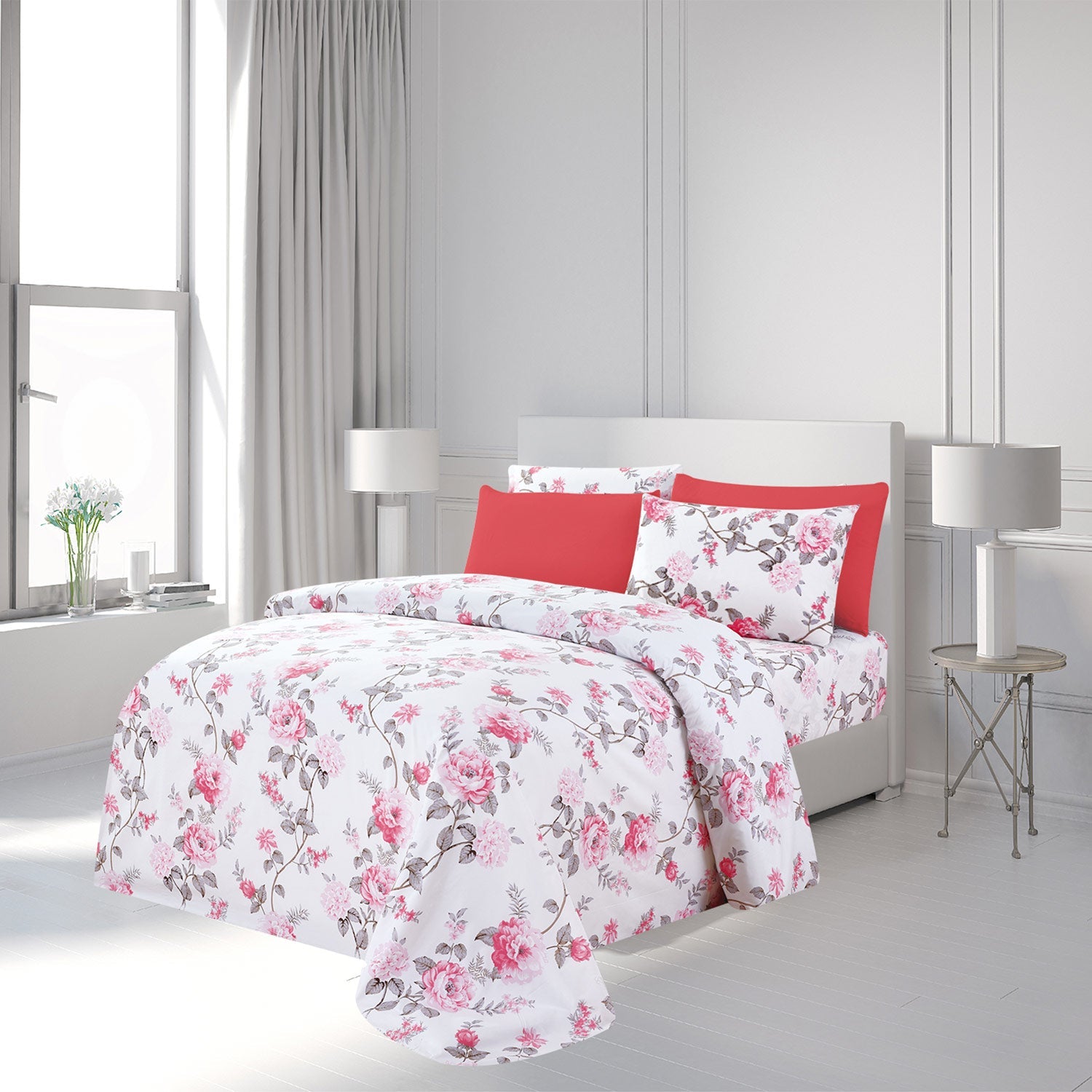 Add a designer accent to any bedroom in your home with the Premius Rose premium luxurious wrinkle-free microfiber sheet set. Perfectly update to bring beauty and grace to any room decor. This super soft and cozy sheet set features beautiful printed pink roses on gray leaves and vines on a white background that will bring life into your sleep space. Coordinating shams with the printed floral design pair beautifully with the sheet set with two extra solid colored pillow cases that completes the ensemble. Comes with a full length flat sheet and a 15 inch deep pocket fitted sheet. This modern printed sheet set is made of incredibly soft and durable 2000 series microfiber fabric. The fabric is durable, breathable, and water repellent. It is resistant to wrinkling, staining, abrasion, or sunlight. This set is also machine washable to promote easy maintenance. The sheet set will make an ideal addition to almost any bedroom decor that embodies timeless style and sophistication. Great for either an adult room, a child bedroom, or a guest room. This super soft sheet set has a look that is sure to add a touch of elegance and a new look to any room. The sheet set will make an ideal addition to almost any bedroom decor that embodies timeless style and sophistication. CARE: Machine wash separately in warm water. Do not bleach. Remove and fold. May require light ironing. SIZE: King. INCLUDES: (1) Fitted Sheet: 78x80+15 Inches, (1) Flat Sheet: 106x102 + 4 Inches, (2) Pillow Shams: 20x40 Inches, (2) Solid Pillow Shams: 20x40 Inches. Queen. INCLUDES: (1) Fitted Sheet: 60x80+15 Inches, (1) Flat Sheet: 90x102 + 4 Inches, (2) Pillow Shams: 20x30 Inches, (2) Solid Pillow Shams: 20x30 Inches. Full. INCLUDES: (1) Fitted Sheet: 54x75+15 Inches, (1) Flat Sheet: 80x96 + 4 Inches, (2) Pillow Shams: 20x30 Inches, (2) Solid Pillow Shams: 20x30 Inches. Twin. INCLUDES: (1) Fitted Sheet: 39x75+15 Inches, (1) Flat Sheet: 66x96 + 4 Inches, (1) Pillow Sham: 20x30 Inches, (1) Solid Pillow Sham: 20x30 Inches. MATERIAL: Microfiber Polyester. COLOR: Pink-White
