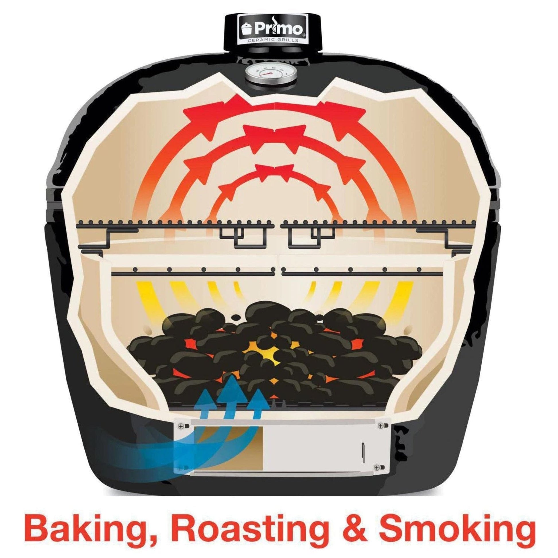 The oval-shape of the Primo Oval kamado smoker provides ample space inside the firebox to place the hot coals on one side (the left side near the bottom vent is recommended), leaving the other side void of a heat source. This setup creates two truly distinct zones of heat, a key part of many outdoor cooking recipes.