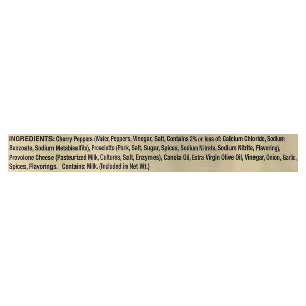 Generously stuffed with Provolone and Prosciutto di Parma, our fiery homemade cherry poppers are a uniquely hearty treat that are ideal for snacking or as an addition to your next antipasti.