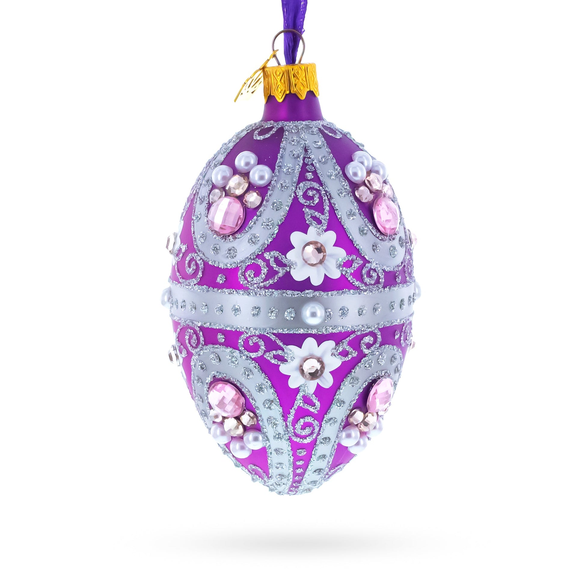 Purple Elegance with Pearls and Floral Accents Glass Egg Ornament 4 Inches