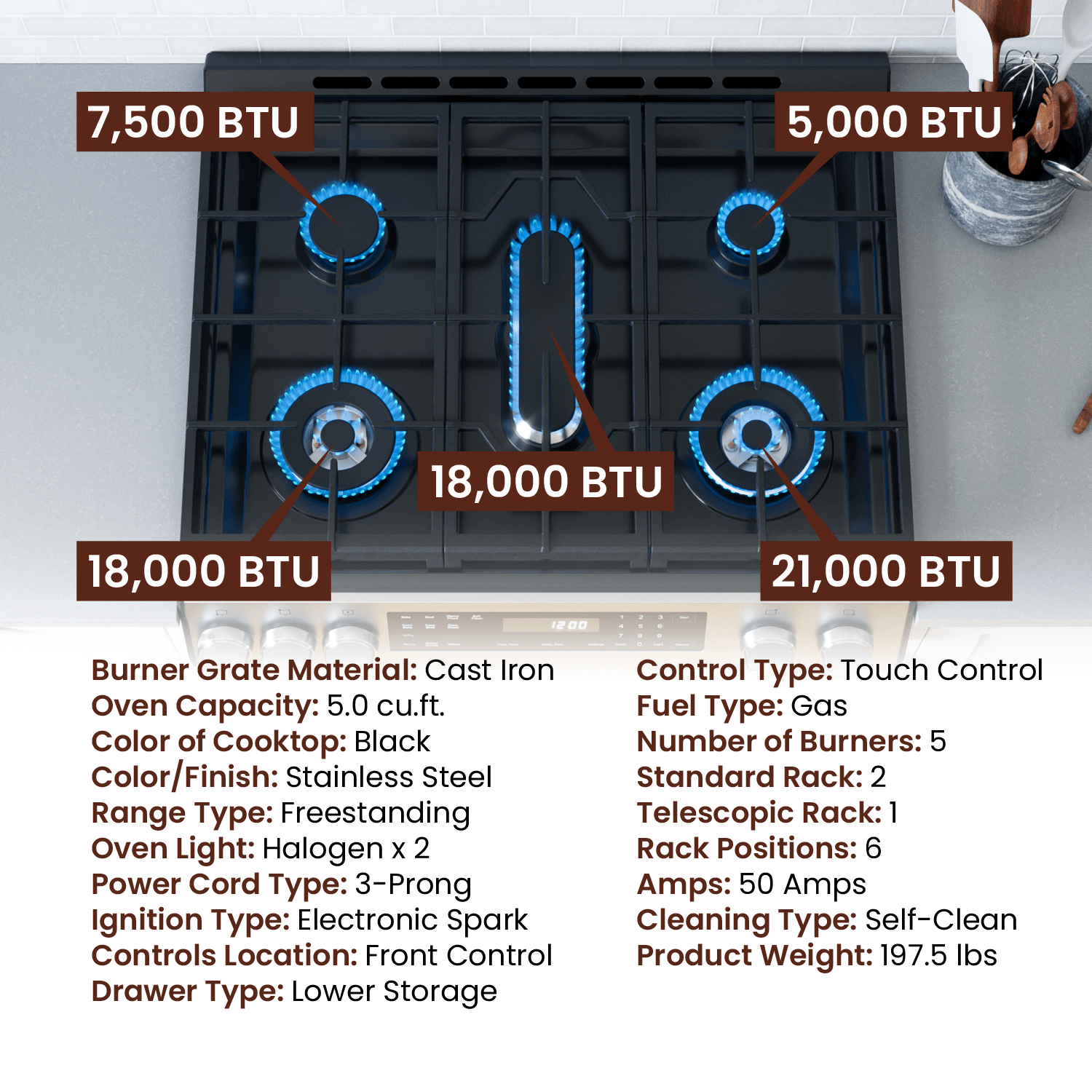 30" Range: Designed for versatility, featuring 5 burners, including a griddle burner, to handle everything from simmering to searing with ease.