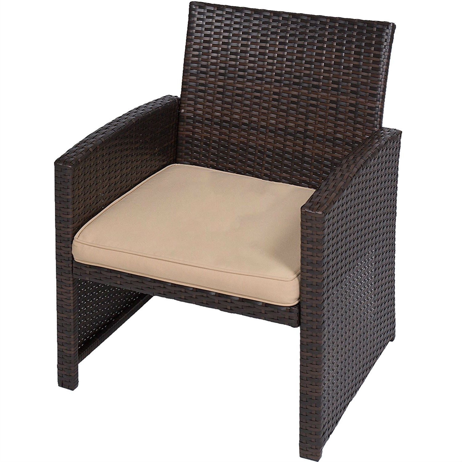 Brown Resin Wicker 4-Piece Modern Patio Furniture Set with Beige Padded Cushions Wicker furniture set features 1 double sofa w/cushion, 2 single sofas w/cushions, and 1 table with tempered glass Sturdy steel frame and high-quality wicker that can support up to 300 pounds per seat will make this set a mainstay in your patio for years Comfortable sponge padded cushions feature removable tan polyester covers that allow for easy cleaning and maintenance Table with removable tempered glass adds a sophisticated touch and allows you to place drinks and meals at arm's reach