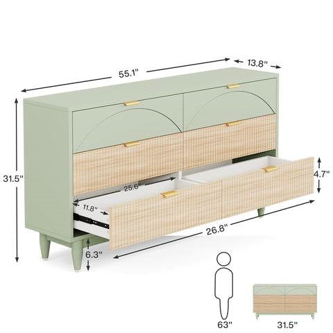 This stylish Retro Mint Green Light Wooden 6 Drawer Dresser, boasting a sleek look, unique double-arcs, and wavy fronts for a modern vibe. With dimensions of 55.12"W x 13.78"D x 31.5"H, this dresser provides ample storage. It's perfect for organizing essentials and displaying decor on its large top surface. Made from premium MDF for durability, it features smooth metal glides for easy access and robust legs for stability. This versatile piece is suitable for bedrooms, living rooms, or hallways. It's perfect for compact spaces, serving as a TV stand, bedside table, or storage cabinet.