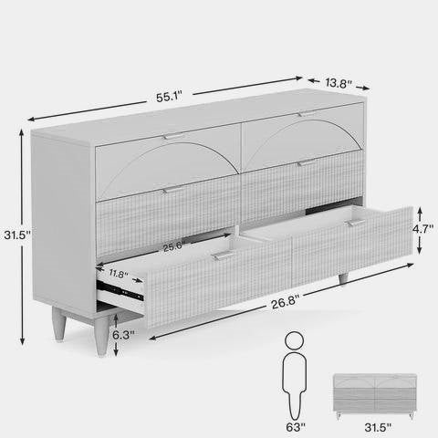 This stylish Vintage Retro Brown Light Wooden 6 Drawer Dresser, boasting a sleek look, unique double-arcs, and wavy fronts for a modern vibe. With dimensions of 55.12"W x 13.78"D x 31.5"H, this dresser provides ample storage. It's perfect for organizing essentials and displaying decor on its large top surface. Made from premium MDF for durability, it features smooth metal glides for easy access and robust legs for stability. This versatile piece is suitable for bedrooms, living rooms, or hallways. It's perfect for compact spaces, serving as a TV stand, bedside table, or storage cabinet.