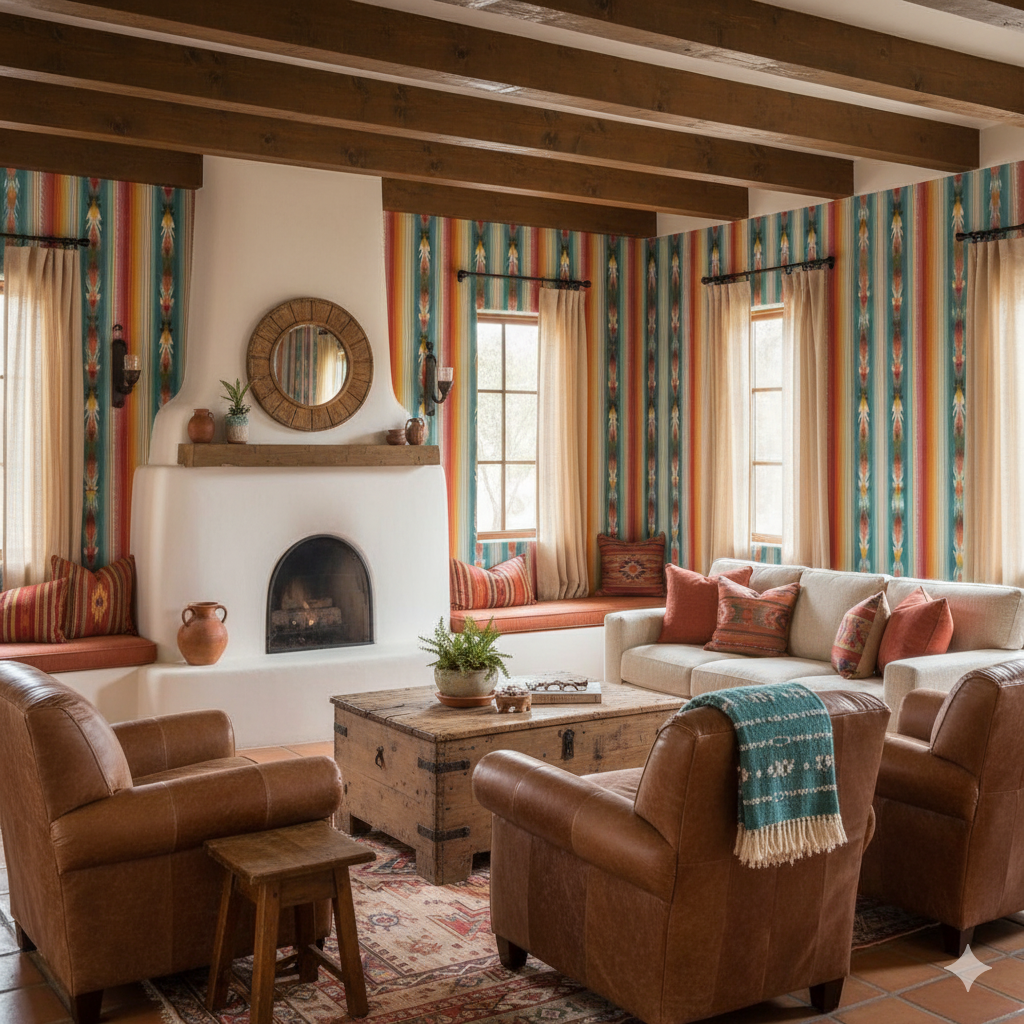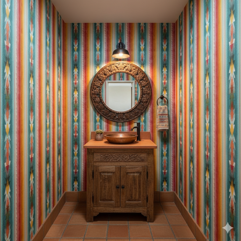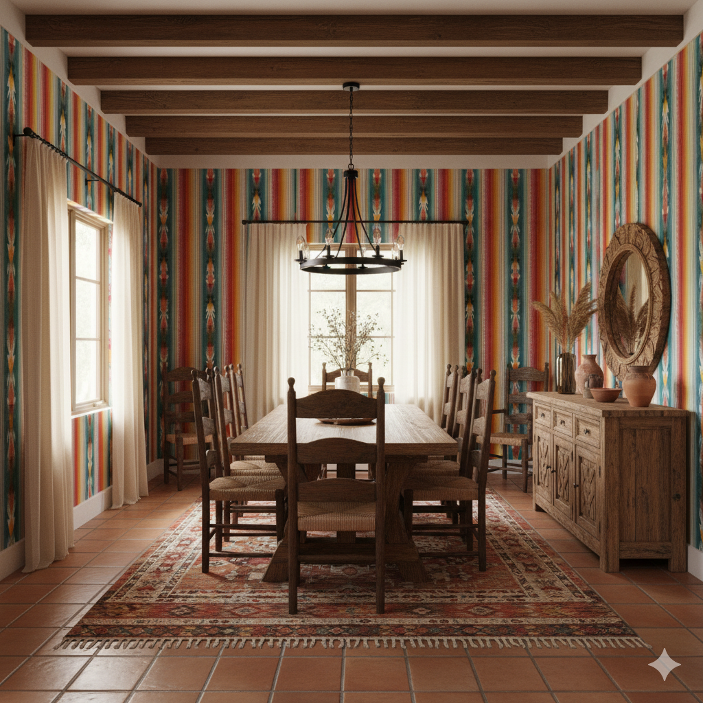 Vivid vertical bands inspired by traditional Mexican serape blankets, featuring layered hues of turquoise, fiery red, golden yellow, burnt orange, and ivory. The painterly textures give the stripes movement, while the repeating symmetry grounds the design in heritage-inspired craftsmanship. This wallpaper is ideal for kitchens, dining rooms, or accent walls in eclectic living spaces, where it infuses energy, warmth, and cultural richness. Pair it with rustic woods, colorful ceramics, and leather upholstery for a fully immersive Southwestern aesthetic.