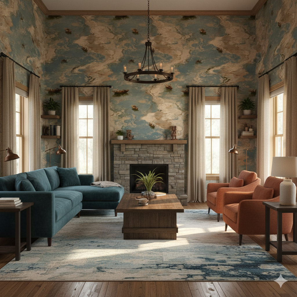 Swirling waters take on a painterly, almost marbled effect in hues of soft blue, cream, and tan, dotted with fishing boats and oarsmen. The rippling current is captured with such fluid brushstrokes that it feels alive, in constant movement. This pattern merges artistry with atmosphere, making it ideal for hospitality interiors, upscale restaurants, or homes that want to blur the line between fine art and functional design. Its palette of natural tones ensures versatility, pairing equally well with light wood, stone, or contemporary concrete finishes.