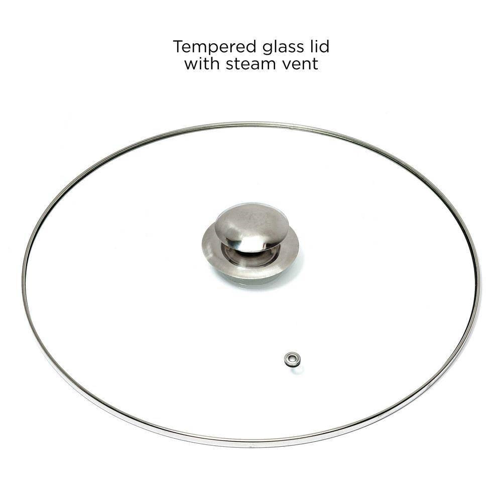 - Oven safe up to 450°F Tempered glass lid with steam vent