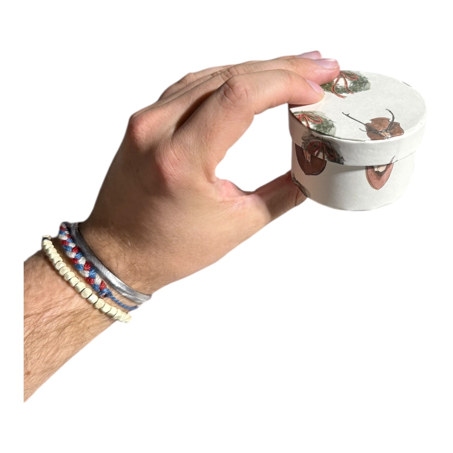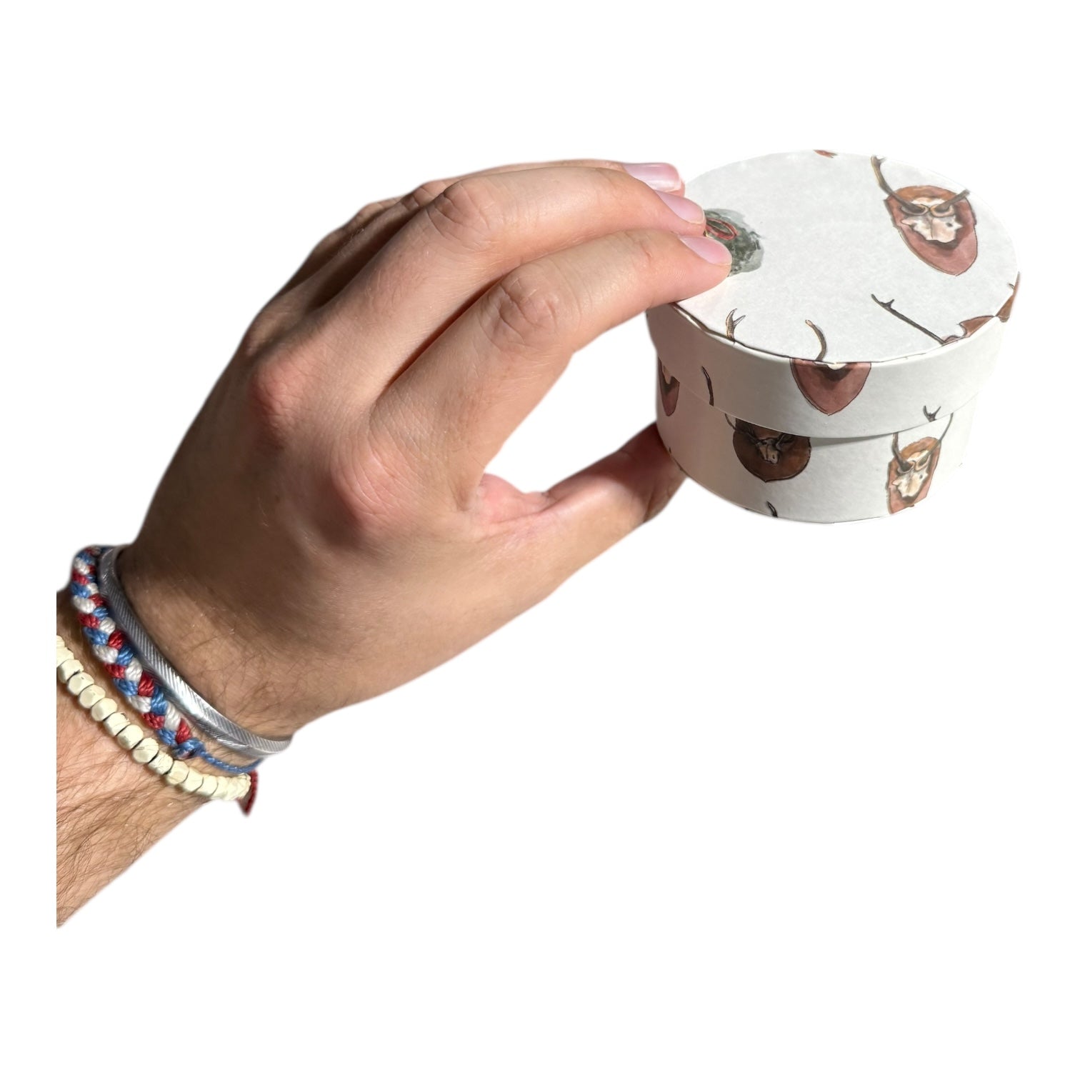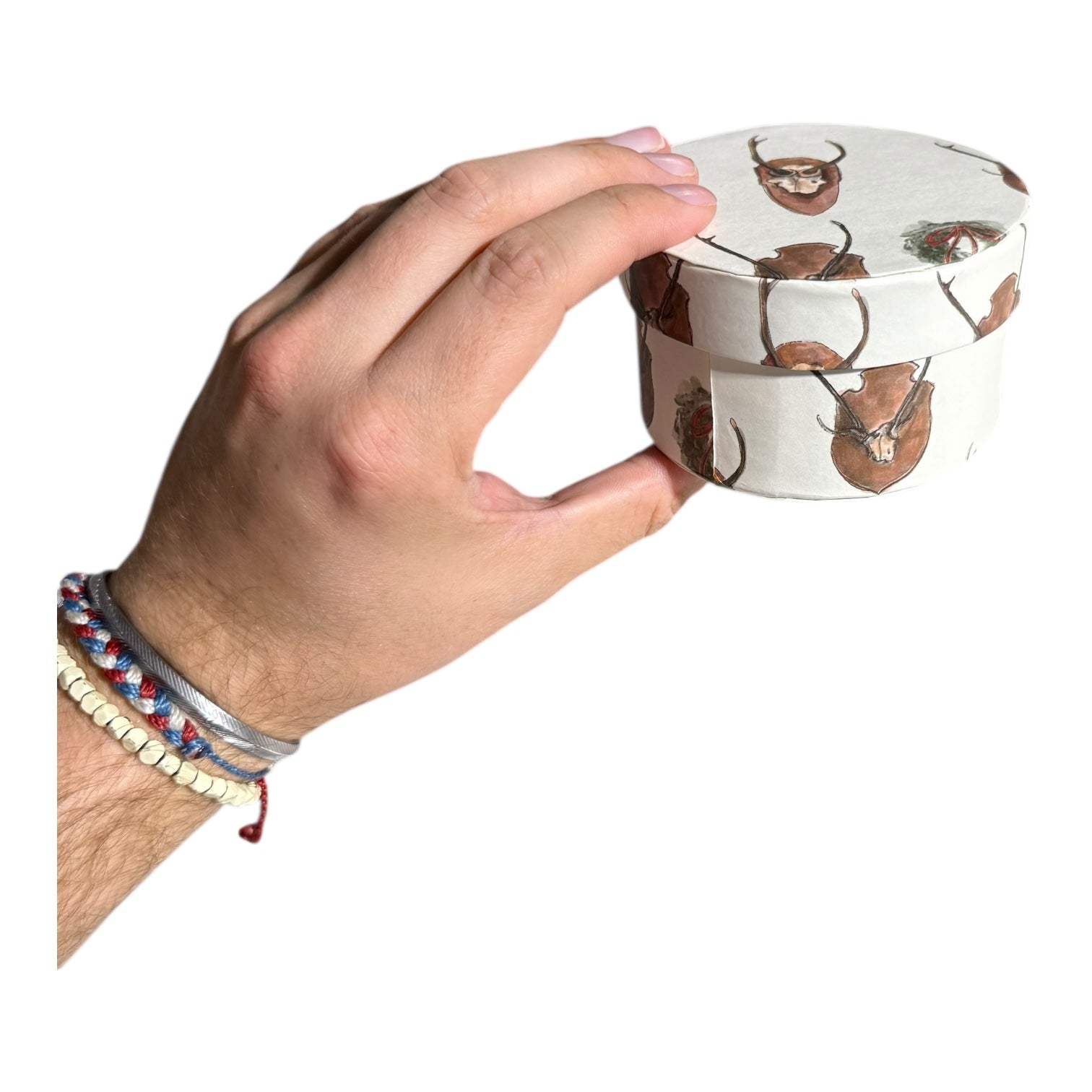 These handmade round nesting gift boxes bring both charm and practicality to your gift-giving. Crafted from recycled paper, each box features deer antlers and wreath designs. Ideal for wrapping small treasures, organizing trinkets, or adding a decorative accent to your holiday displays, these boxes offer sustainable style for any occasion.