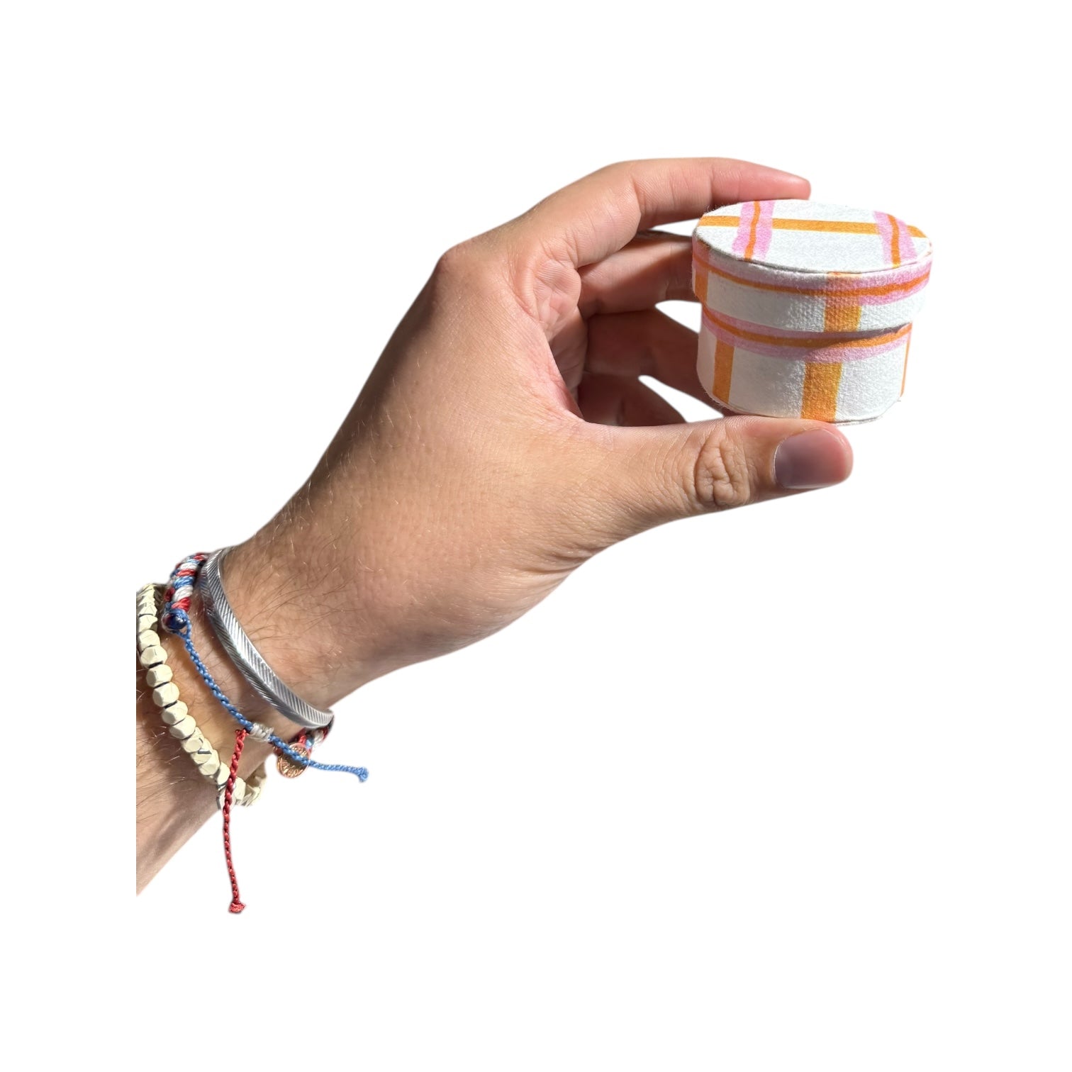 These handmade round nesting gift boxes bring both charm and practicality to your gift-giving. Crafted from recycled paper, each box features a colorful plaid-inspired design that layers beautifully when stacked or used individually. Ideal for wrapping small treasures, organizing trinkets, or adding a decorative accent to your holiday displays, these boxes offer sustainable style for any occasion.