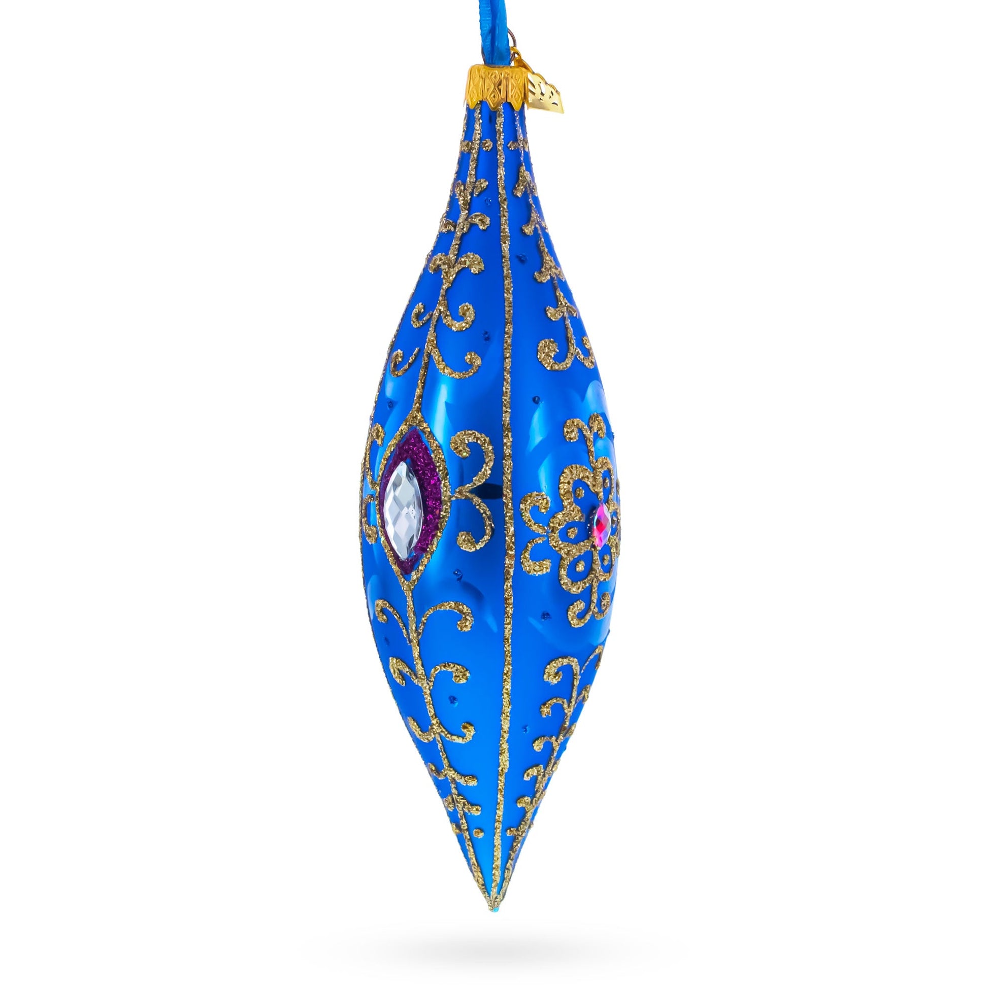 Royal Blue Jewel Scroll Elongated Pointed Teardrop Finial Glass Christmas Ornament