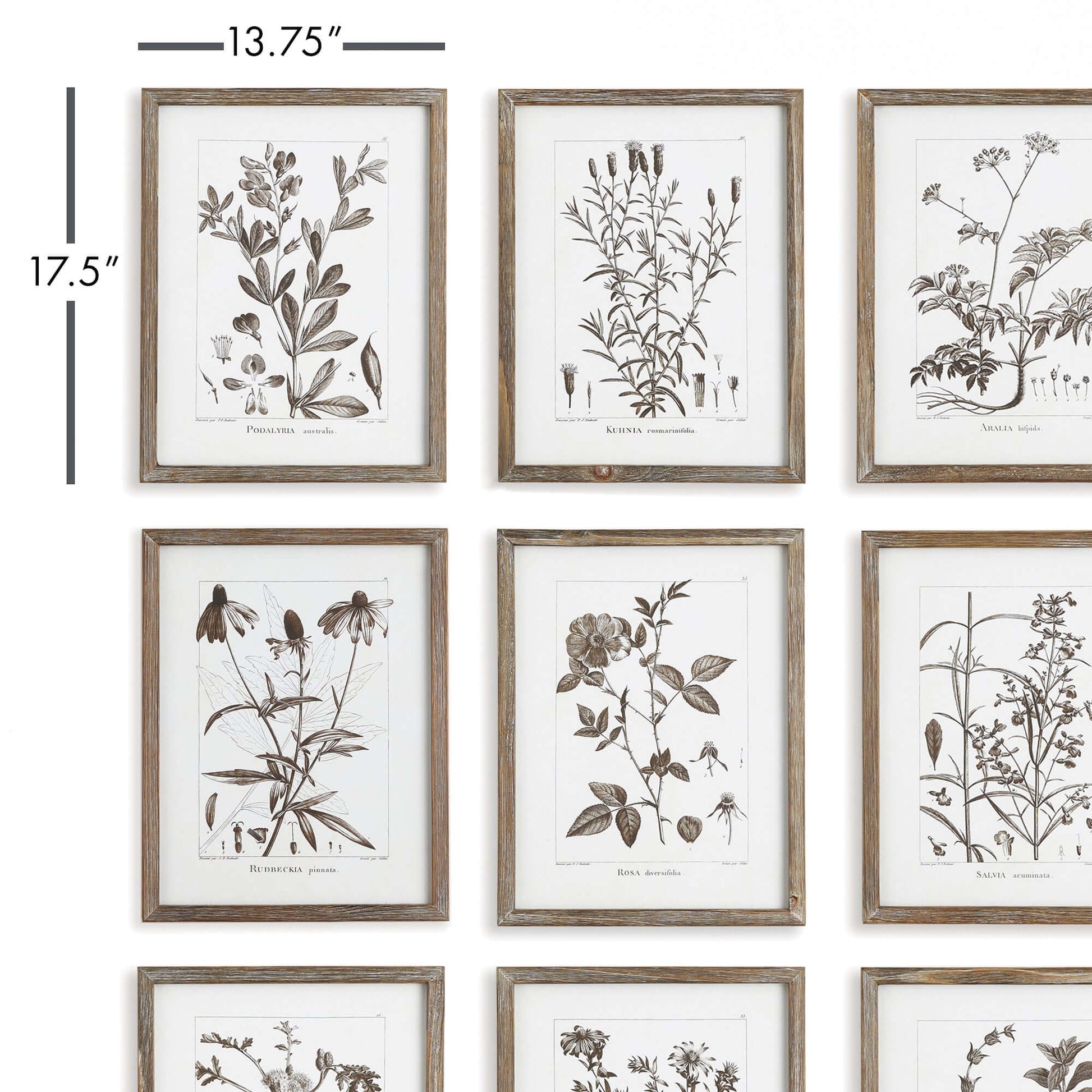 The rustic botanical sepia wall art prints offer a timeless celebration of nature’s quiet beauty through the lens of vintage design. This elegant set of nine framed prints showcases traditional botanical illustrations in warm sepia tones, each rendered with scientific precision and old-world charm. Real matting and distressed wood frames give the pieces a layered, heirloom feel—reminiscent of pressed flowers and hand-drawn studies found in antique journals.
