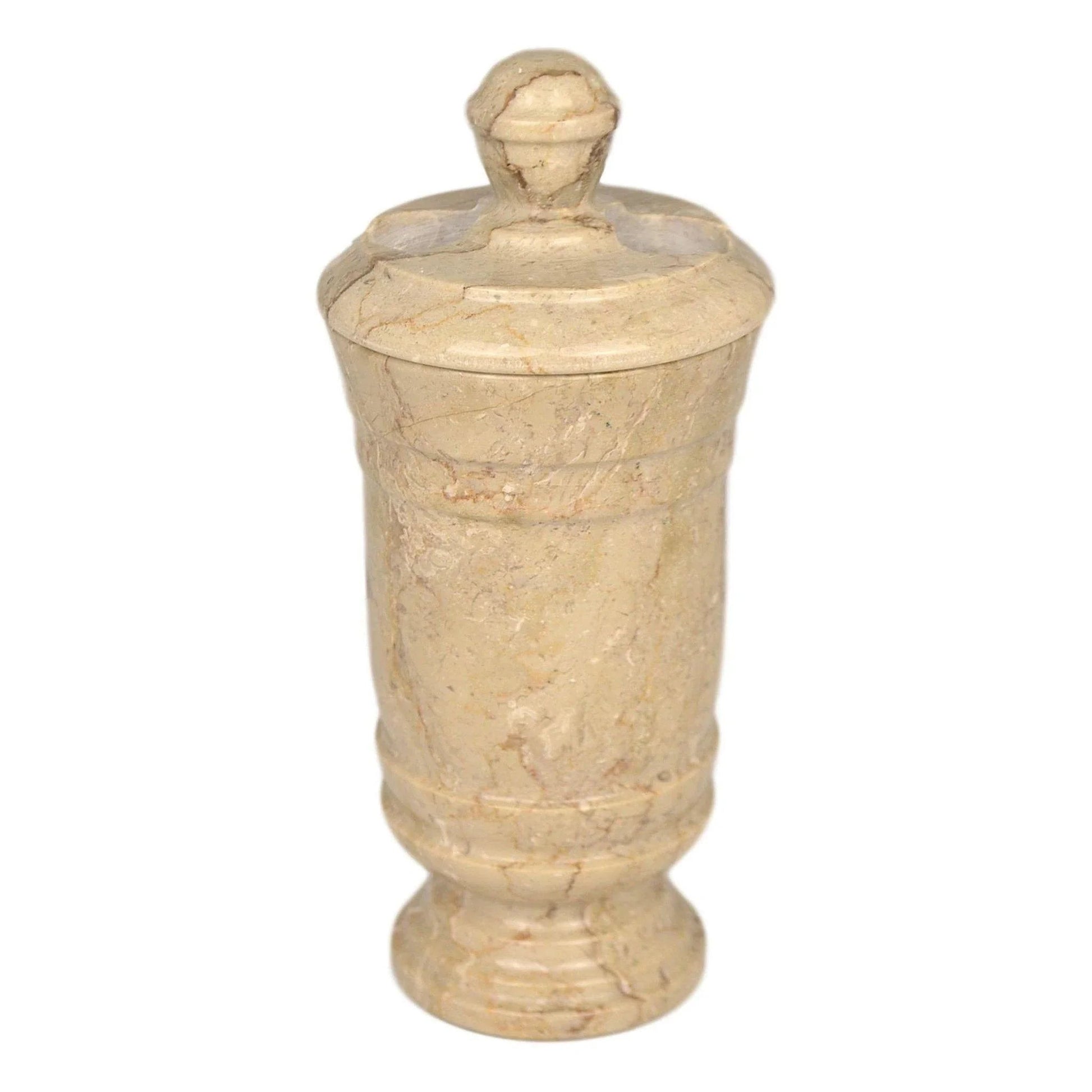 Handcrafted & polished from Sahara Beige Marble, this toothbrush holder is part of Nature Home Decor's Tasmanian Collection bathroom accessories. Includes: tumbler, soap dish, liquid soap dispenser, waste basket, tissue holder & canister. Buy as complete set & save.Size: 3.5 x 6 inches.