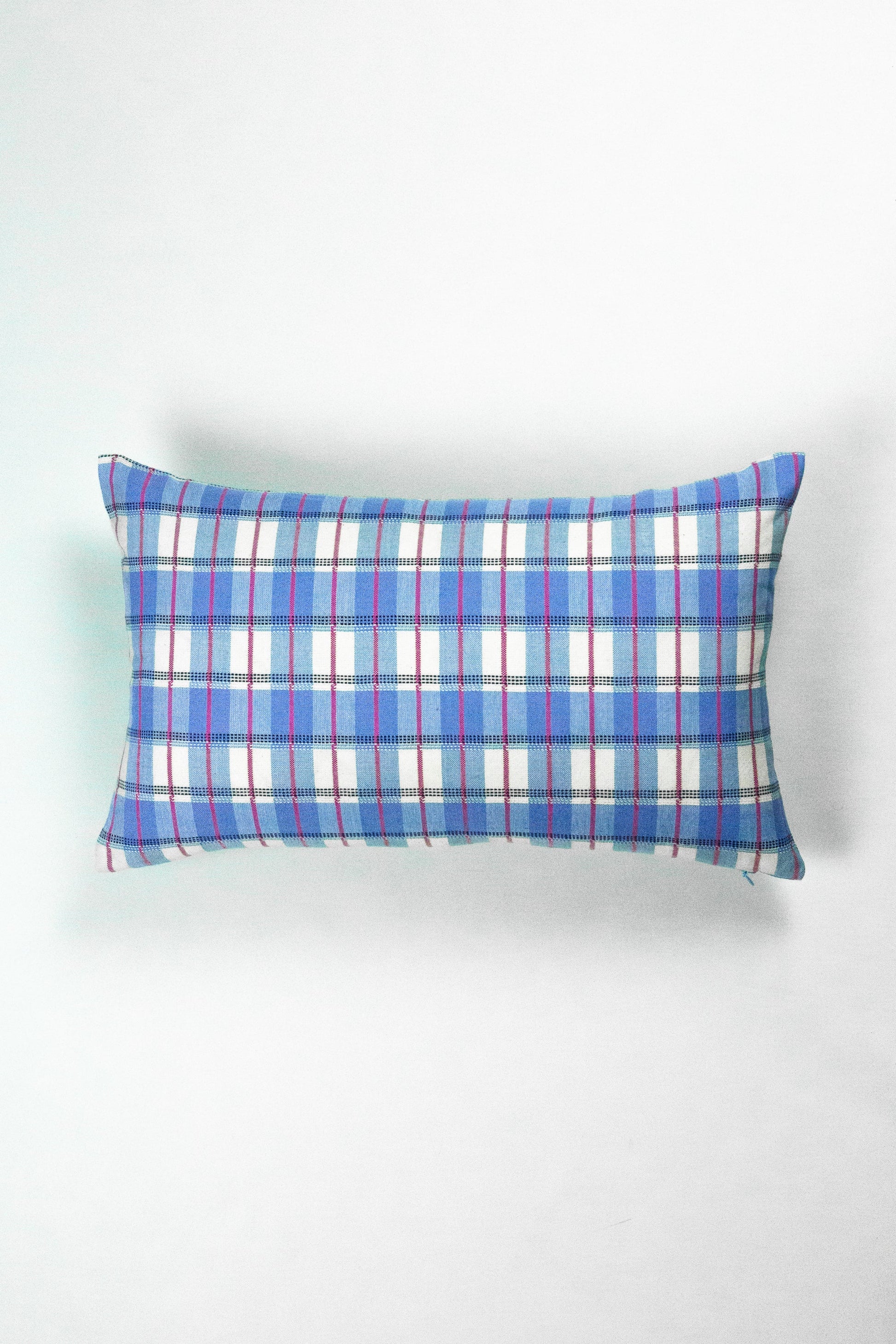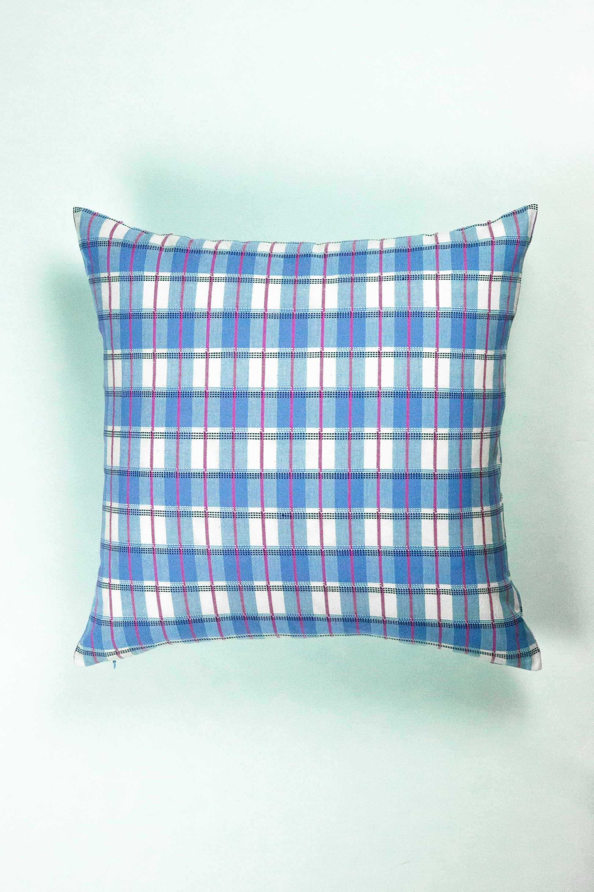 Blue & white plaid pillow, ethically handwoven by artisans in Chiapas, Mexico on traditional footlooms. With hints of hot pink and navy, this updated classic plaid will be a lively addition to any décor.