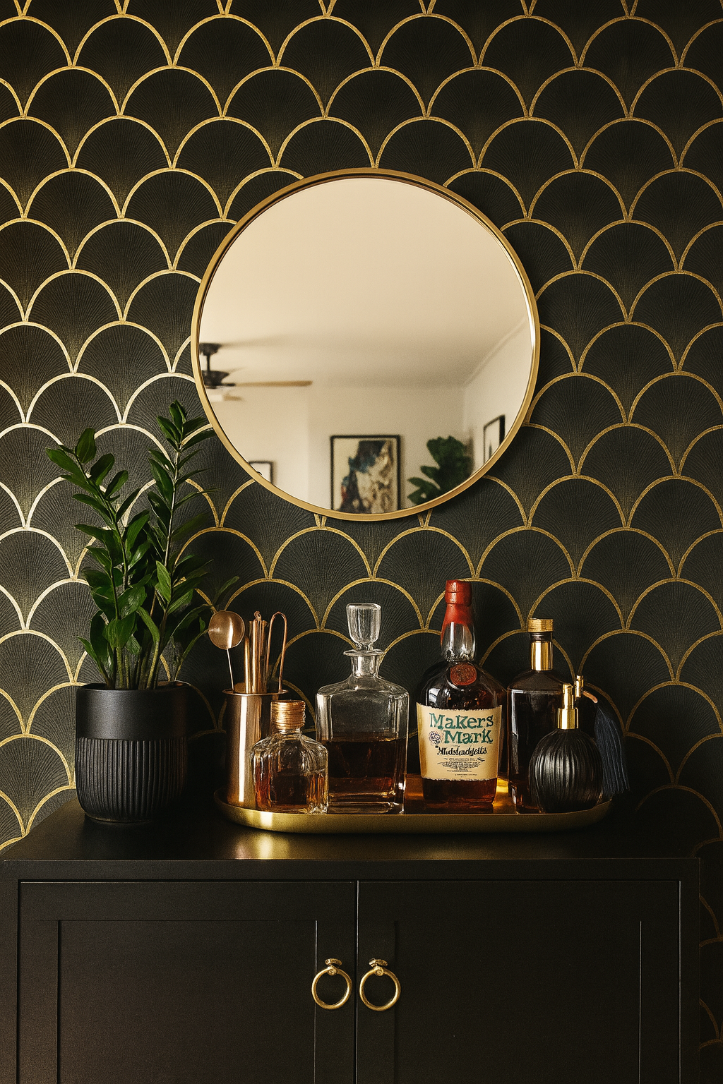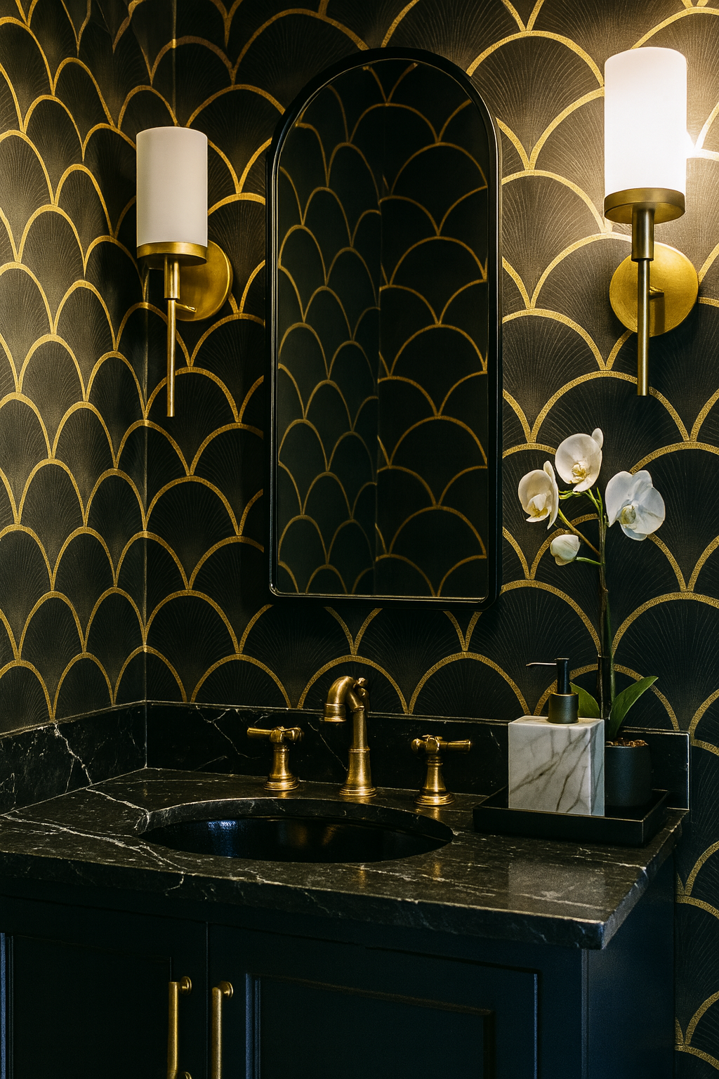 Scales of Fortune blends Japanese seigaiha waves and Art Deco shell forms in perfect symmetry. Gleaming gold arcs layer over a velvety black base, forming a rhythmic, fish-scale structure that shimmers with quiet luxury. Ideal for stairwells, entryways, or any space begging for drama and balance, this pattern delivers timeless glamour with a touch of myth.